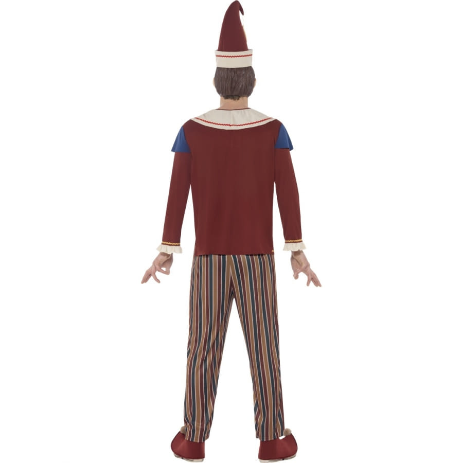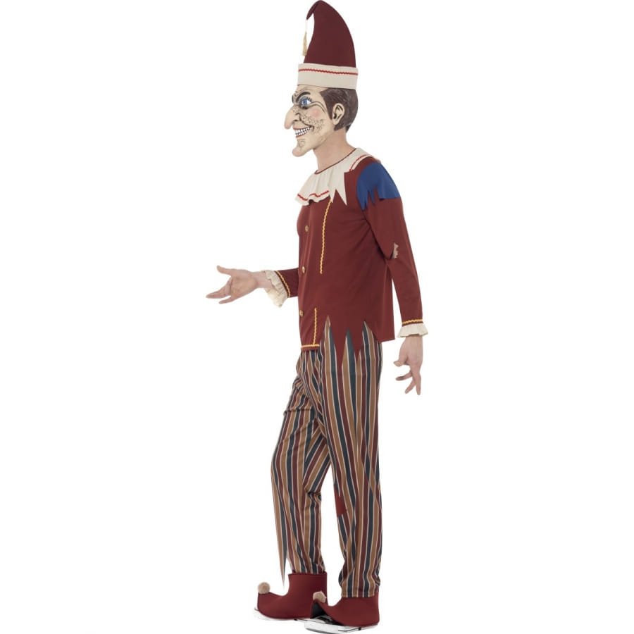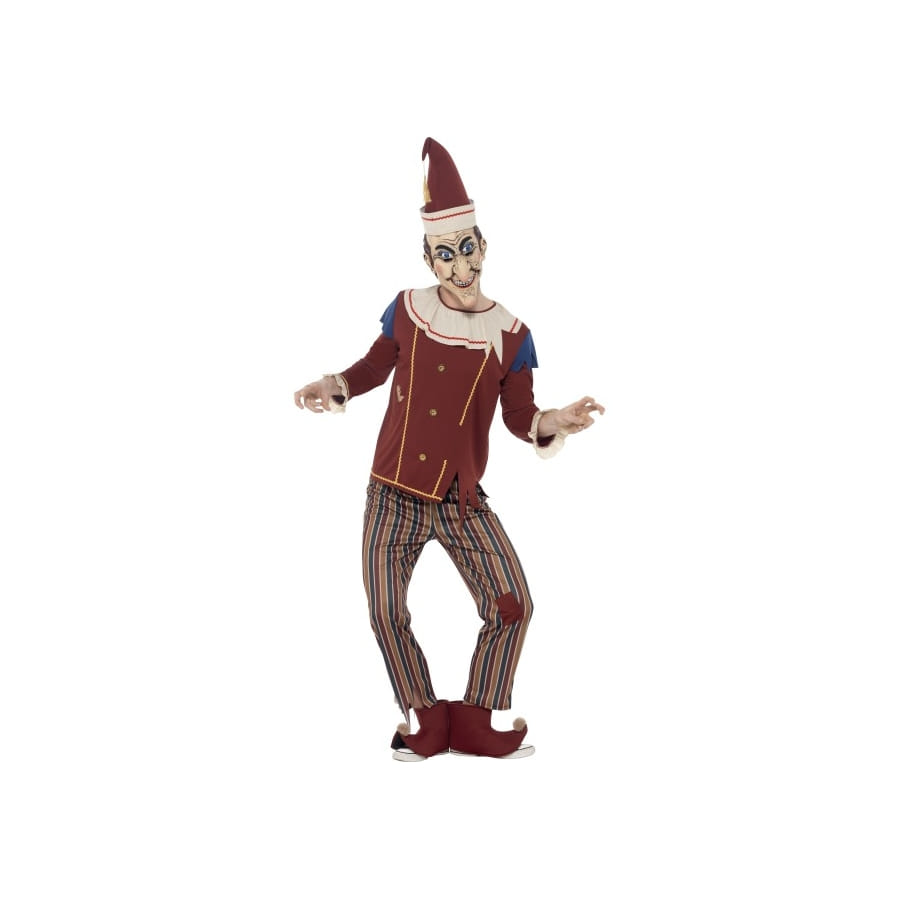Punch le possédé se demandera s'il a un sosie lorsqu'il vous verra dans ce déguisement Punch le possédé. De plus, c'est un personnage bien effrayant, fait pour être incarné à Halloween par les hommes les plus courageux. Pour ce déguisement, vous aurez en tout et pour tout un haut de couleur rouge avec un col blanc et des épaulettes bleues, un pantalon à rayures verticales bleu, marron, rouge et blanc, une coiffe pointue de couleur rouge et blanche, une paire de couvre-bottes rouge avec le bout pointu qui remonte, auquel est attaché un pompon, et enfin un masque en latex, l'élément clé de ce déguisement.