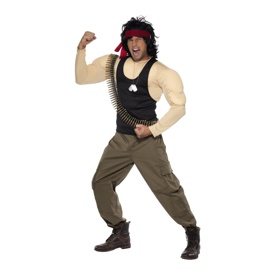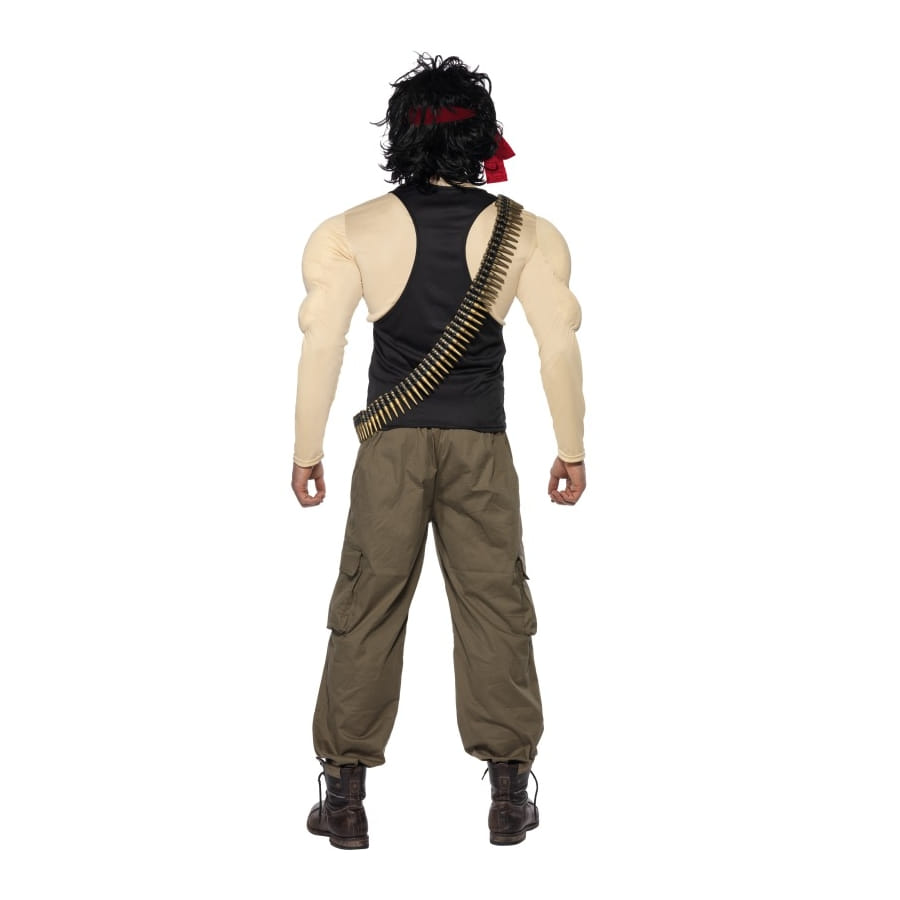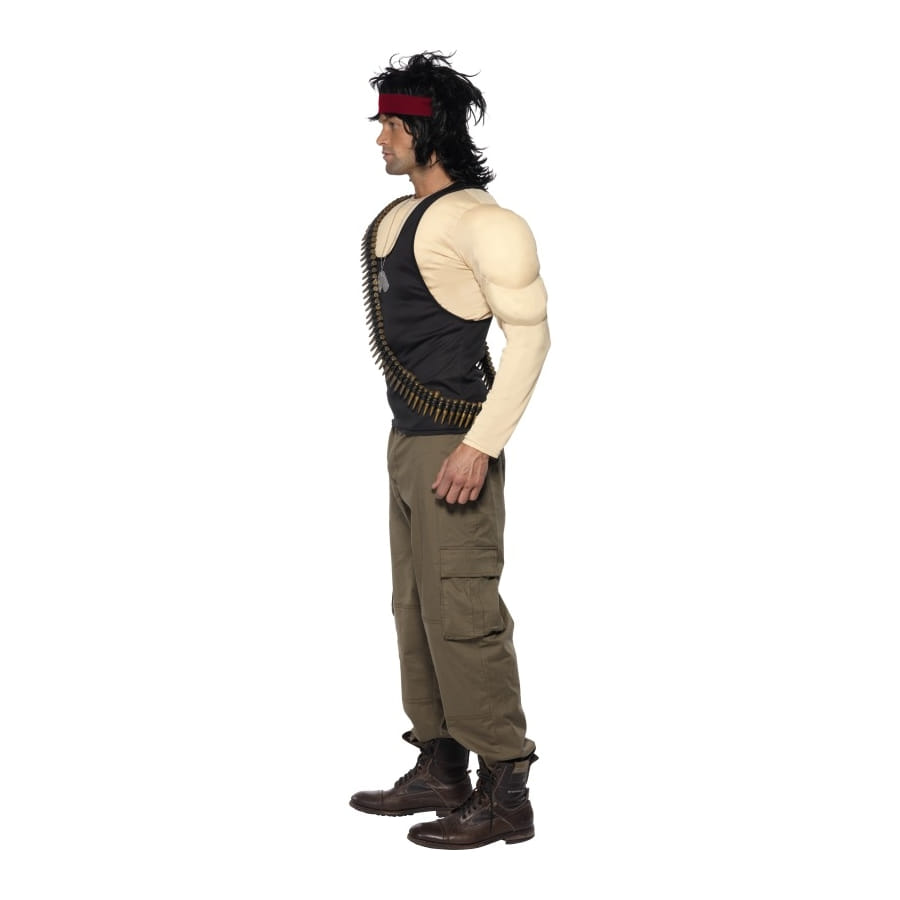 Avec ce costume de Rambo vous pourrez le porter pour une fête ayant pour thème cinéma, muscle, star ou encore action. Ce déguisement qui est sous licence Rambo est fait d'une perruque de couleur noir, d'un top rembourré avec effet musclé, de munitions, de plaque argenté et d'un pantalon. Vous incarnerez votre personnage préféré avec ce déguisement.