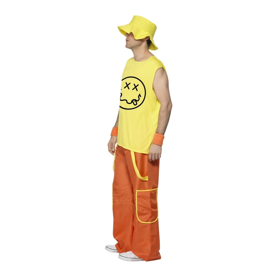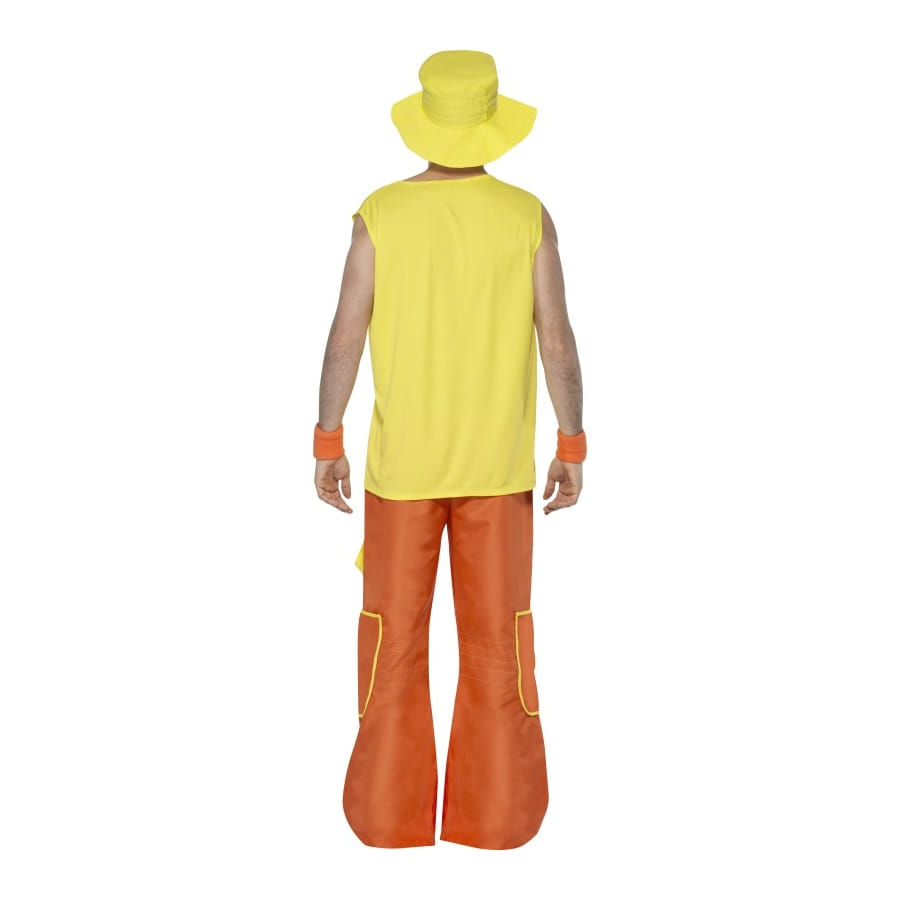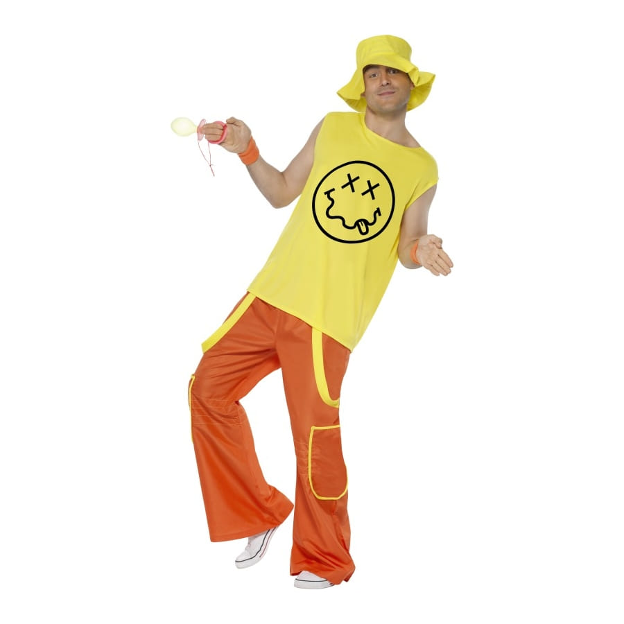 Déguisement de rave party, pour homme, composé d'un top jaune imprimé d'une tête, d'un pantaln orange et d'un chapeau jaune. Le tout est disponible en taille S, M ou L. Il fera de vous un fêtard hippie.