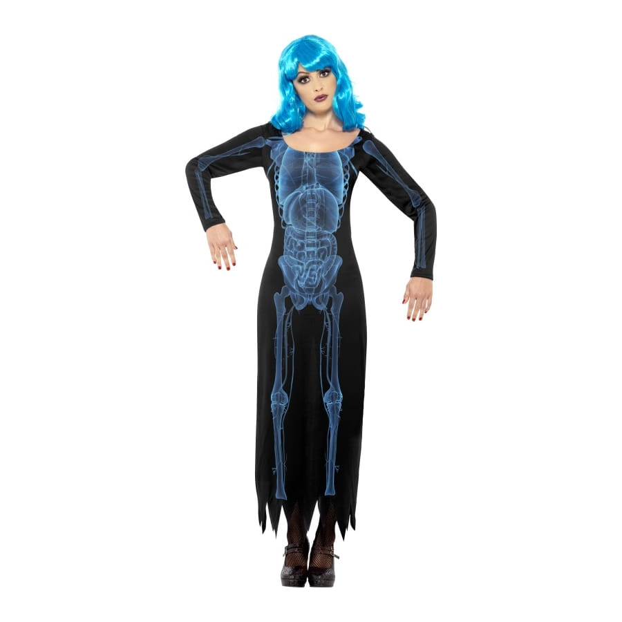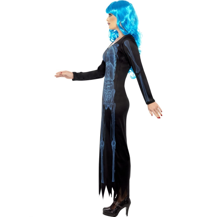 Un déguisement rayon X pour femme vous pourrez le porter pour le carnaval. Ce costume vous pourrez le porter pour Halloween ou vous incarnerez un squelette. Ce déguisement est une robe manche longue de couleur noir, il y a le dessin d'un squelette dessus. Le déguisement est de couleur noir et bleu.