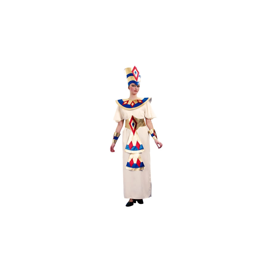 Transformez vous en reine égyptienne avec cet ensemble costume de reine d'Egypte. L'ensemble contient la longue robe beige, la ceinture dorée colorée de rouge et de bleu, les manchettes , la coiffe et le large col de même couleur. Pour le maquillage, utilisez un crayon contour des yeux pour vous dessiner de grands yeux.
