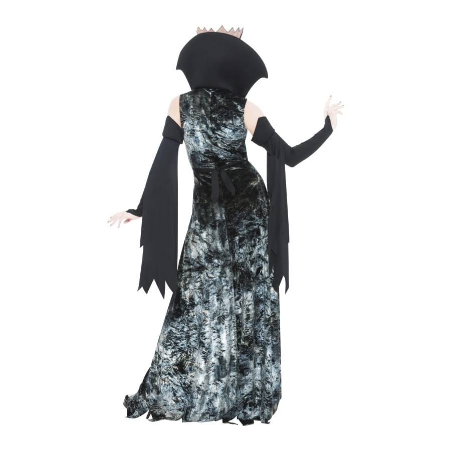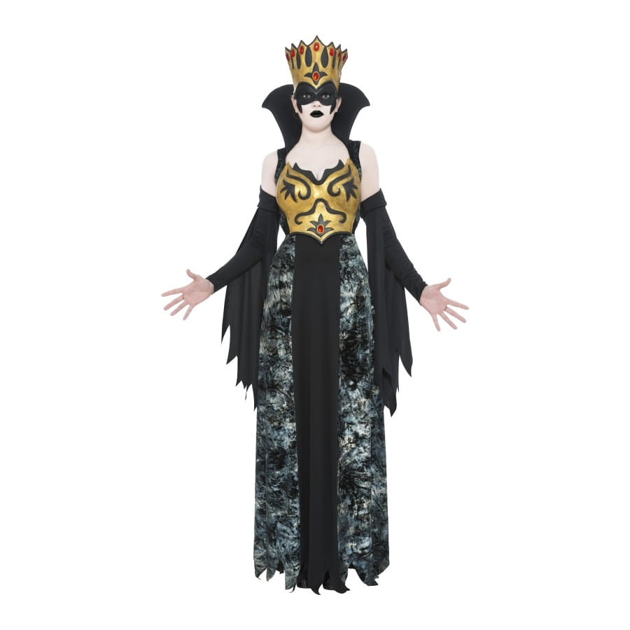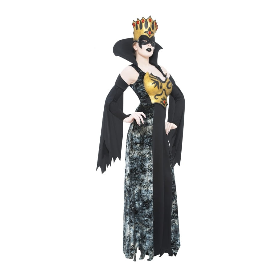 Déguisement de reine fantôme, pour femme, composé d'une robe, d'une paire de manches, d'un corset en latex et d'une couronne avec masque. La robe est longue, principalement noire, avec des détails en dentelle. Les manches sont également noires, tout comme le col et le masque, tandis que le corset et la couronne sont tous deux dorés. Cet ensemble est disponible en taille S, M ou L. Incarnez une reine maléfique revenue du monde des Morts à l'occasion d'Halloween.