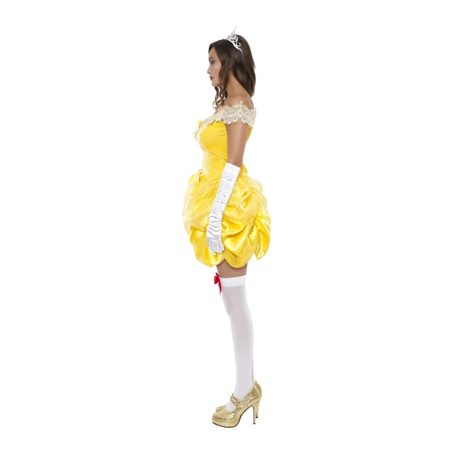 Déguisement de princesse, pour femme, constitué d'une robe jaune, blanche et rouge, disponible en taille S, M ou L. Elle ressemble beaucoup à la tenue de Belle dans le classique "La Belle et la Bête", mais en version plus sexy. Elle est dont idéale pour une fête déguisée entre adultes.