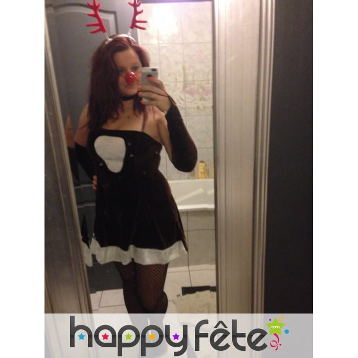 Déguisement de femme renne sexy composé d'une robe marron et blanche, de gants marrons, d'un nez rouge et de collier marron. Cet ensemble est disponible en taille S, M ou L. Il sera idéal pour la Noël ou pour une fête basée sur le thème des animaux.