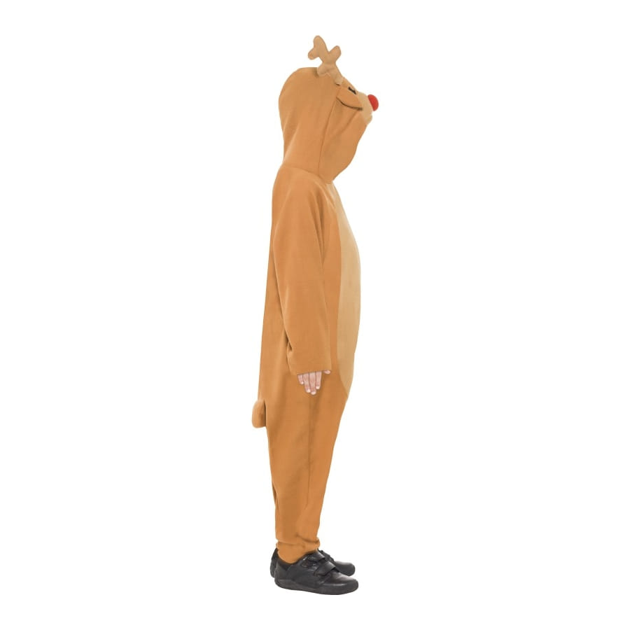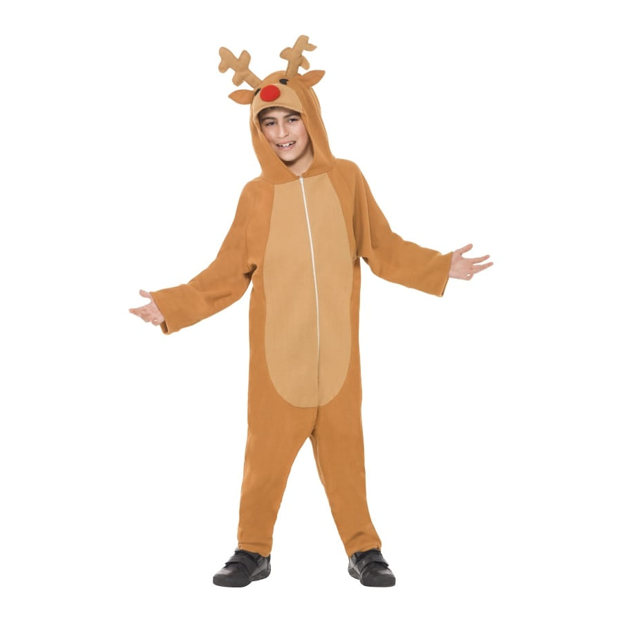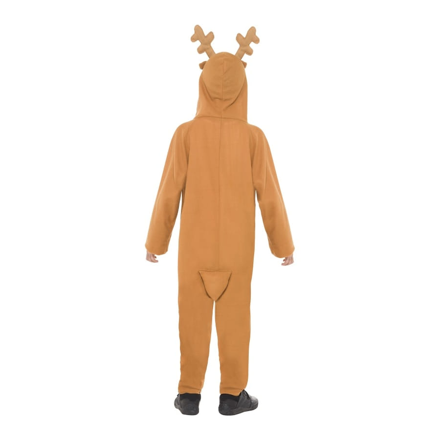 Costume composé d'une salopette avec une capuche représentant une tête de renne. Uniquement destiné aux enfants. La salopette possède une tirette sur l'avant permettant une mise en place facile. La correspondance des tailles est celle ci : S (4 à 6 ans) M (7 à 9 ans) L (10 à 12 ans).