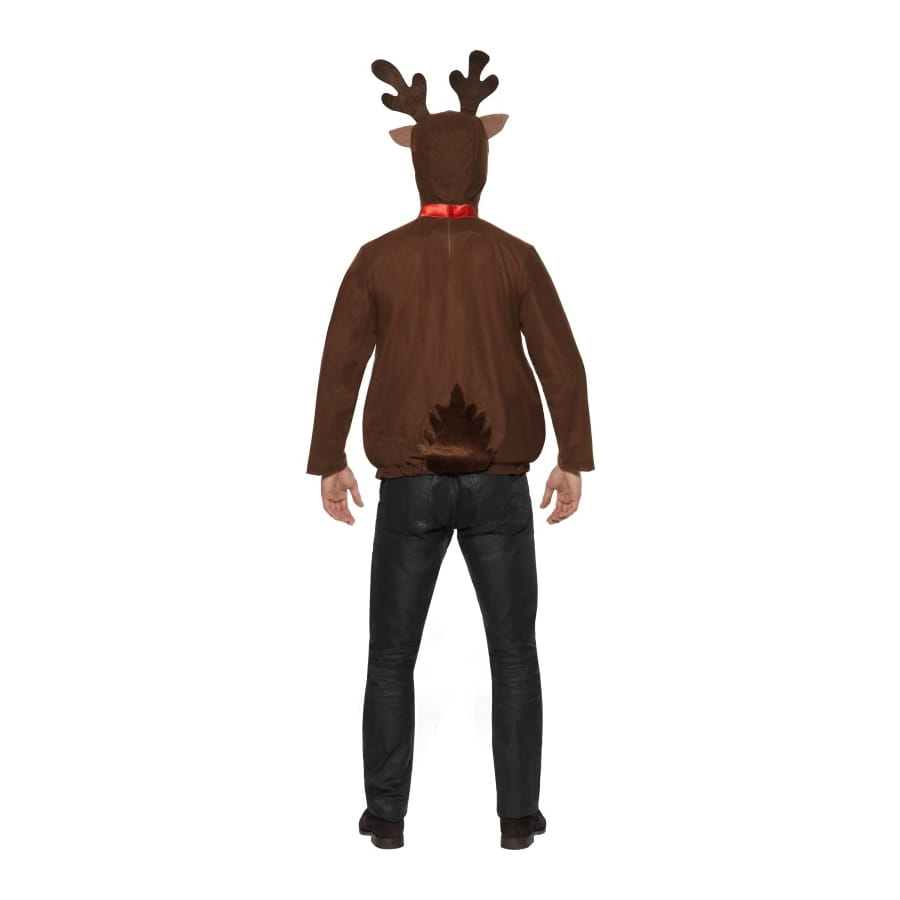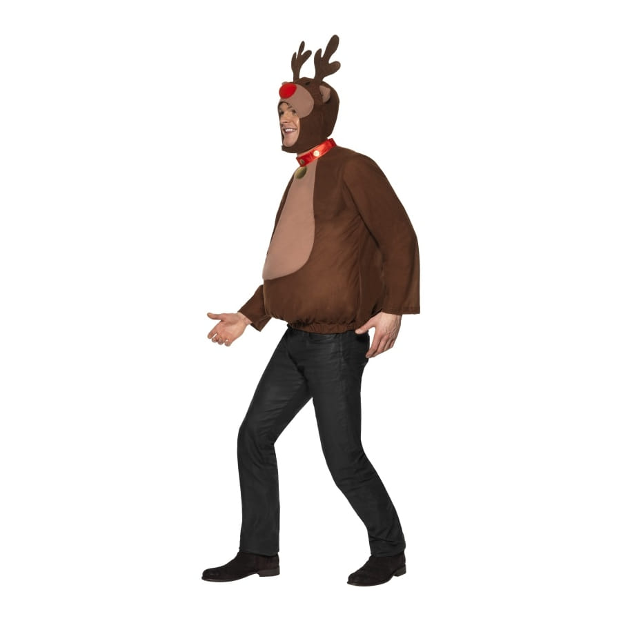 Déguisement de renne, pour homme, composé d'une combinaison avec gros ventre et collier ainsi qu'une tête de renne avec nez rouge. Vos enfants adoreront votre déguisement de Noël!