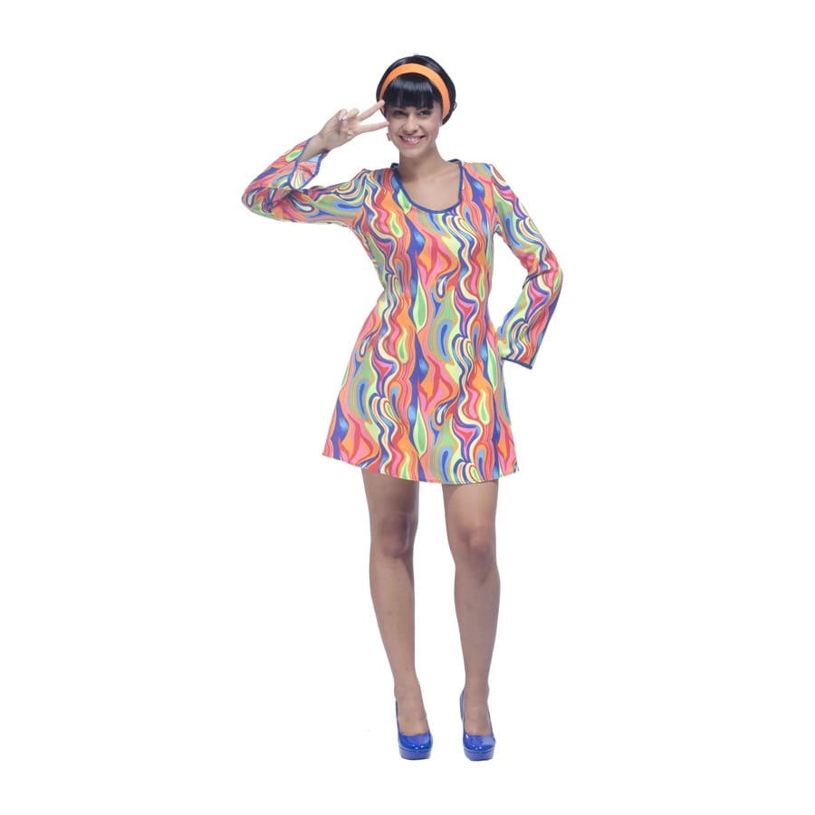 Le temps d'une soirée Disco, retournez dans les années 60 et illuminez la piste de danse grâce à ce déguisement robe à motifs flashy années 60. Ce déguisement comprend une robe courte multicolore à manches longues et un bandeau orange. Très confortable, cette petite robe vous permettra de danser jusqu'au petit matin sans ressentir le moindre gène. Sachez que vous n'êtes pas obligée d'attendre le prochain événement déguisé pour ressortir cette jolie tenue, car vous pouvez très bien la porter en été, à l'occasion d'une sortie entre amies par exemple. A accompagner de chaussures à talons assorties.