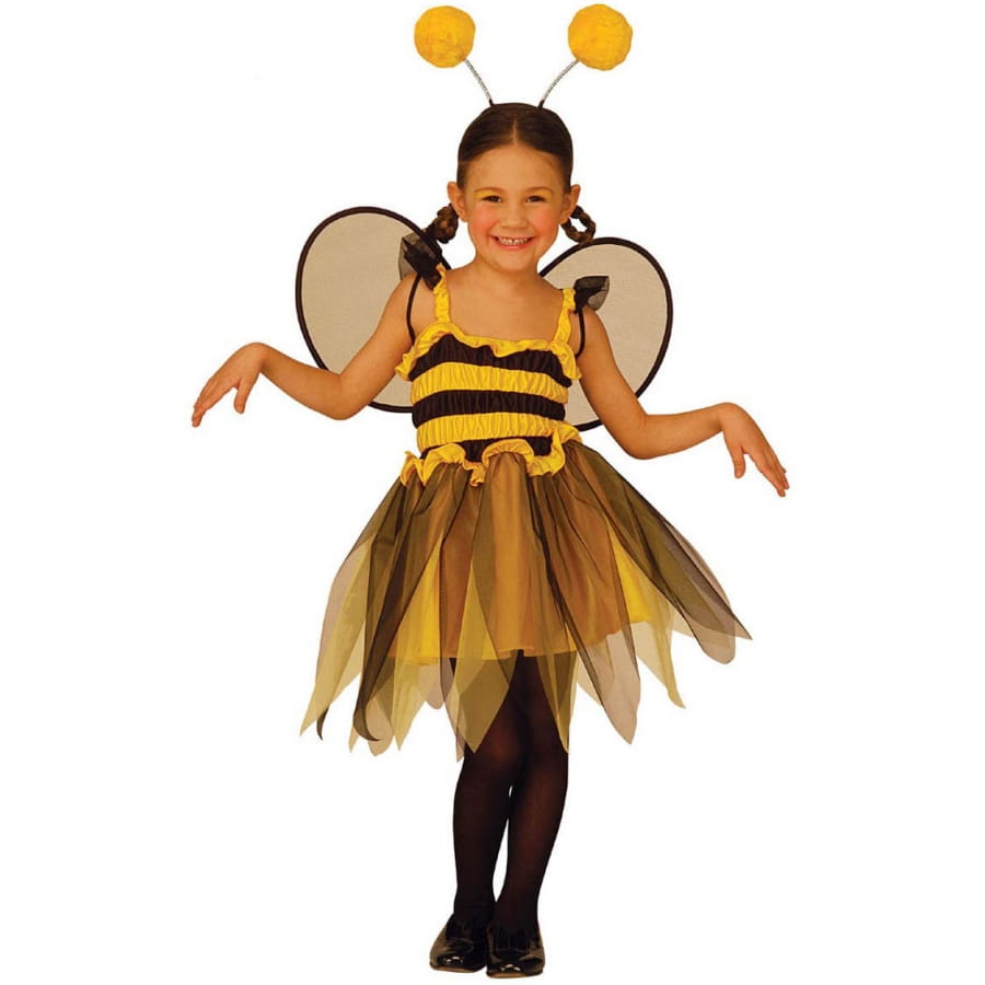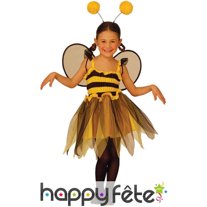 Les enfants aiment particulièrement les fêtes, surtout quand il faut porter un costume. A cet effet, pour ces jeunes demoiselles, nous vous proposons ce déguisement robe abeille pour fillette. L'ensemble est constitué par une robe à rayures jaunes et noires, dont la particularité est que le haut est élastique, et le bas est en tulle noir, disposé de façon asymétrique. Une paire d'ailes noires fixées à l'aide d'un élastique se porte tel un sac à dos et pour finir, un serre-tête avec deux gros pompons jaunes en guise d'antennes. Cette tenue conviendra parfaitement aux festivités comme le carnaval, mardi gras, ou les anniversaires à thème, Animal par exemple.
