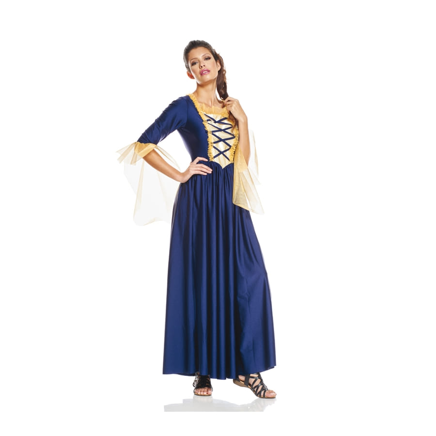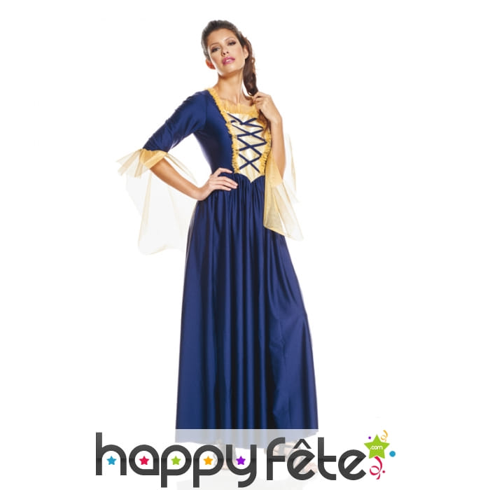 Si vous avez du mal à trouver la tenue parfaite pour votre soirée déguisée ou pour une fête dont le thème est le Moyen Age, nous vous proposons, Mesdames, ce déguisement robe bleue médiévale. Comme sur le modèle, il s'agit d'une longue robe bleue tombant jusqu'aux chevilles. Le devant de la robe est muni d'un empiècement de couleur blanche bordée d'un fin voile doré, et de lacets entrecroisés, du même tissu et de la même couleur que le bas de la robe. Comme pour la plupart des robes d'époques, les manches sont mi-longues et évasées. Pour cette tenue, elles sont bordées de voiles qui viennent caresser les poignets. Enfilez vos plus belles sandales et voilà, vous êtes prête !