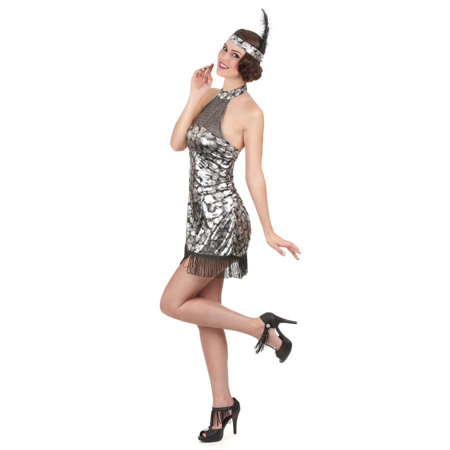Revivez les années 20-30 et la folie des cabarets avec ce déguisement robe courte charleston à dos nu. Destiné à la gent féminine, ce costume se compose d'une robe courte gris foncé en tissu fin et brillant, avec des ronds gris imprimés et de fines franges noires décorant le bas. Cette robe est un dos nu élastique qui se maintient à l'aide d'un scratch à l'arrière de la nuque. La tenue est également composée d'un bandeau élastique assorti à la robe, qui s'adaptera à tous les styles de coiffure, et qui est pourvu d'une plumette noire sur un côté, comme à l'époque charleston. N'oubliez pas de vous procurer une paire de mi-bas noirs parmi nos accessoires pour agrémenter le tout, et de porter des talons aiguille.