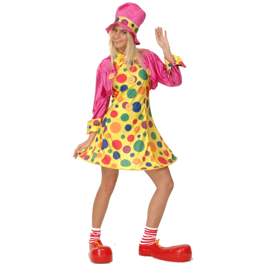 Les clowns sont de vrais as pour animer des fêtes. La gent féminine est invitée à mettre de l'ambiance aux anniversaires et aux soirées déguisées dans ce déguisement robe courte de clown à pois colorés. Cet ensemble multicolore est constitué par une robe et un veston. La robe est de couleur jaune, ornée de pois de diverses tailles et coloris. Quant au veston, il est à manches longues, de couleur rose fuschia, avec le bord intérieur des manches orné de pois multicolores. En guise d'accessoires, le déguisement comprend un noeud papillon de couleur assortie à la robe, et un chapeau haut de forme de couleur rose fuschia avec une bande jaune à pois multicolores.