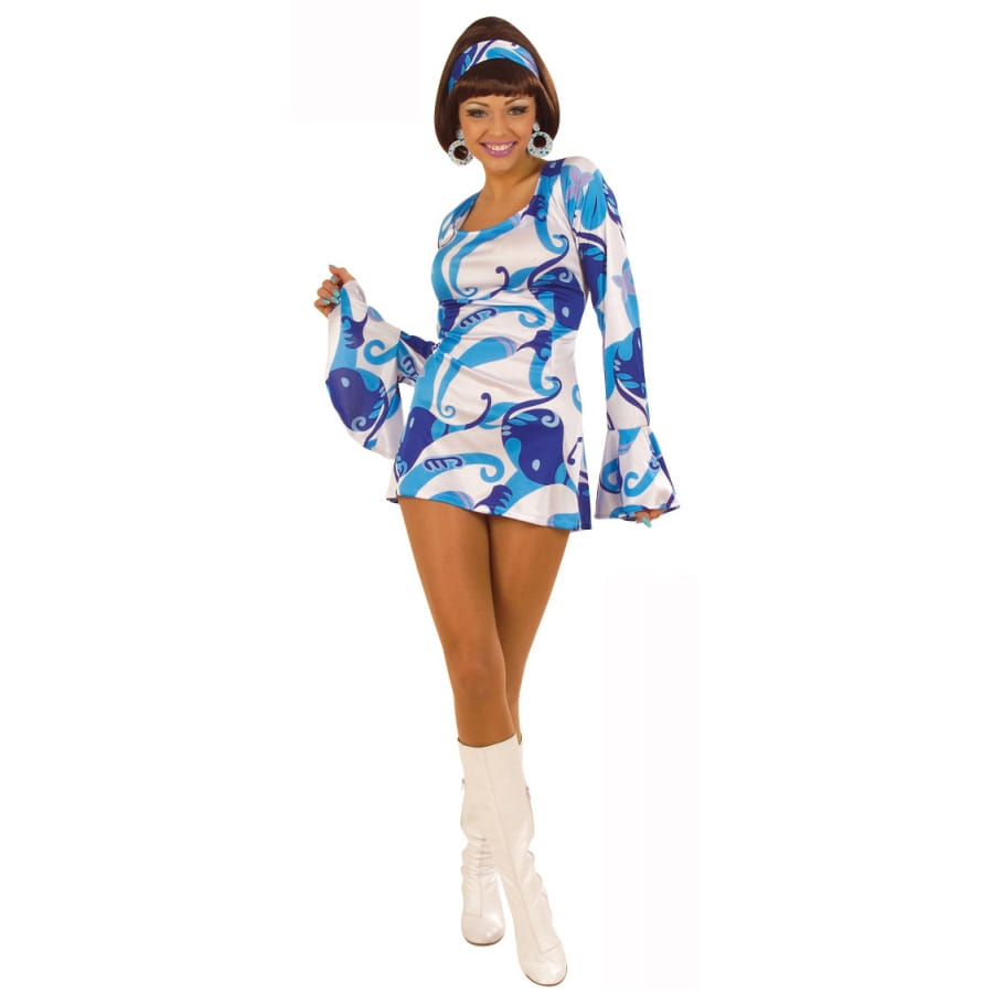 Pour revivre les années disco, nous proposons pour la gent féminine ce déguisement robe courte disco bleu sexy. Il s'agit d'une robe serrée et courte de couleur blanche avec des nuances de bleu clair et foncé. Cette robe est faite dans un tissu satiné à motifs, et le col est caractérisé par un décolleté qui mettra votre poitrine en valeur. Avec des manches évasées aux extrémités, cette robe est une représentation de la mode des années 70 et 80. Pour vous donner du style, un bandeau assorti à la robe vous est fourni, et qui aura pour effet d'égayer votre coiffure. Pour faire plus réel, ajoutez à votre tenue de grosses boucles d'oreilles colorées, comme sur notre modèle.