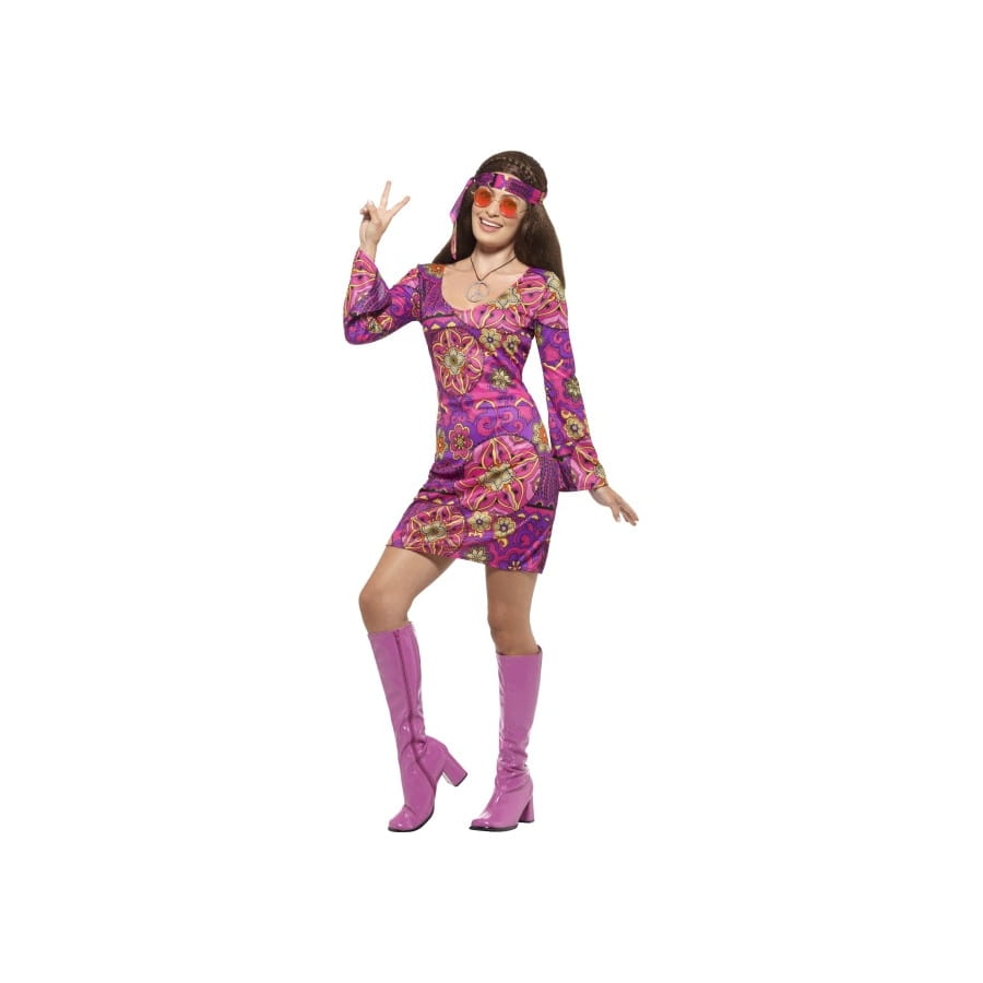 Le mouvement hippie a pris de l'ampleur dans les années 50-60. Ce n'est pas pour autant qu'il ne fait plus d'effet à présent. Le déguisement robe courte Woodstock de Hippie en est la preuve irréfutable. Il est constitué par une splendide robe aux couleurs éclatantes. Le modèle est court mais les manches sont longues. Il est parsemé de superbes motifs hippies dans les couleurs rose et violet. Vous recevrez également un foulard de couleur assortie, à attacher autour de la tête comme un bandeau. Un médaillon avec le symbole peace and love est aussi compris dans la tenue. Ajoutez-y des bottes et des grosses lunettes, et vous serez hippie de la tête aux pieds.