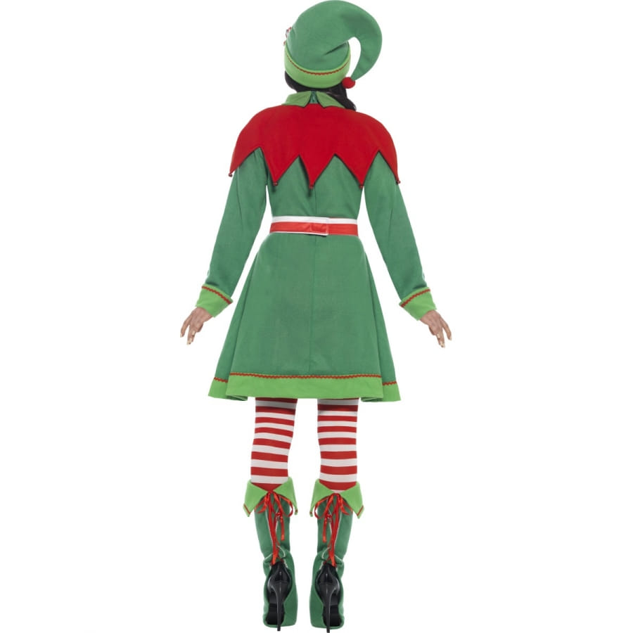 Les elfes du monde féerique de Noël vous apprennent la mode. Devenez une elfe ultra fashion dans ce déguisement robe Elf de Noël pour femme. L'ensemble est constitué par une petite robe verte à manches longues. La couleur rouge a été répartie au niveau des boutons ainsi que du col. Le chapeau est de couleur assortie, il s'agit d'un bonnet d'elfe. De superbes couvre bottes vous sont également fournies pour vous habiller de la tête aux pieds. Une paire de collants à rayures rouges et blanches, ainsi qu'une ceinture de la même couleur accompagne le lot. Vous obtenez ainsi un déguisement d'elfe complet, disposé à vous faire découvrir la magie de Noël.