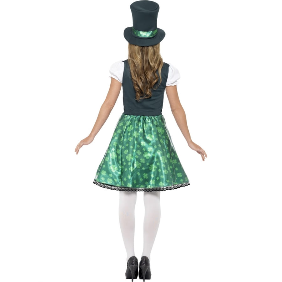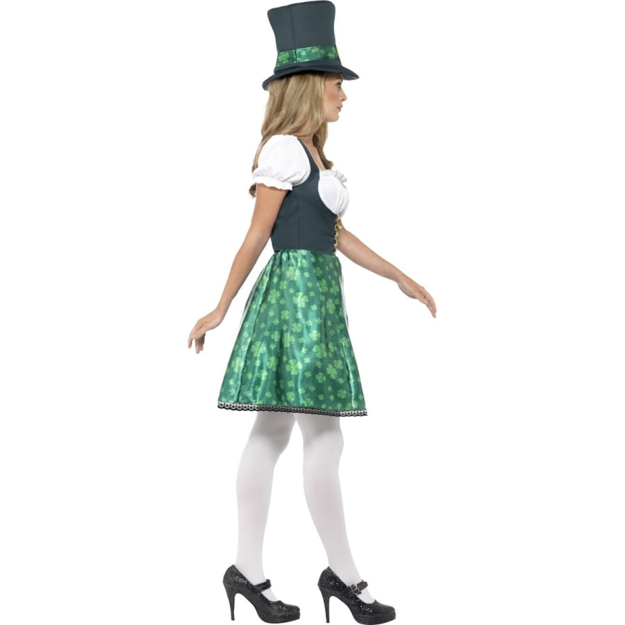 Lors des fêtes de la Saint-Patrick, n'hésitez pas à vous imprégner de la tradition irlandaise en choisissant de vous déguiser en Leprechaun. Nous avons alors ce déguisement robe Leprechaun pour femme, pour celles qui aiment perpétuer les traditions. L'ensemble comprend une robe dont le haut est de la forme d'une chemise blanche et d'un corset vert. Le bas est évasé et de couleur verte avec des motifs de trèfles partout, avec un jupon attaché. Le tout est clôturé par un chapeau de style haut-de-forme de couleur verte et dont le bandeau est muni d'une belle boucle dorée, et porte les mêmes motifs que le bas de la robe. Les tailles que nous avons pour cette tenue sont : L, M, S, XL et XS.