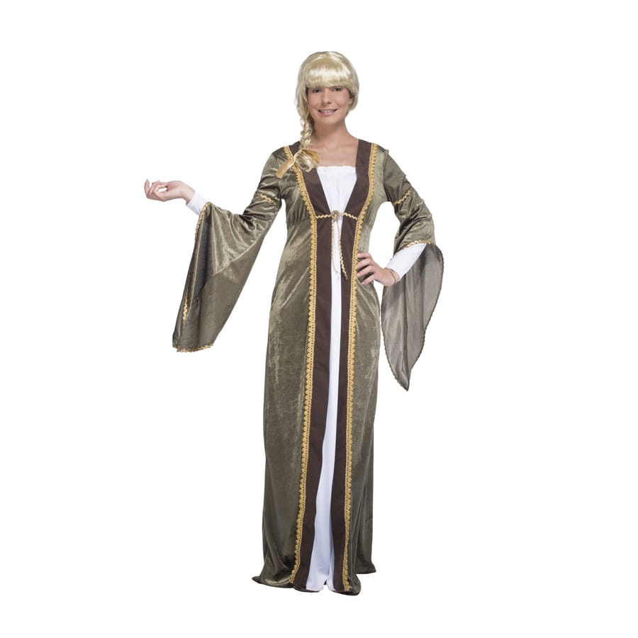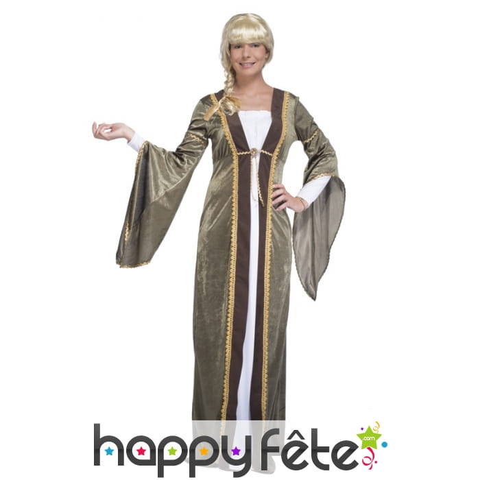 Vous êtes à la recherche d'un déguisement original et élégant pour une soirée sur le thème Moyen âge ? Découvrez ce déguisement robe médiévale verte en velours pour femme et appréciez une transformation stupéfiante. Très réaliste, ce déguisement se compose d'une robe longue verte en velours et d'une coiffe dorée. La robe ouverte sur le devant se ferme au-dessous de la poitrine à l'aide d'un simple ruban doré. Elle présente une parmenture marron et dorée et des manches ange à demi ouvertes sur le dessus. Il est recommandé de porter un autre vêtement en dessous. Nous avons également parmi nos accessoires quelques bijoux et perruques pour compléter votre costume