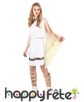 Les romaines avaient également leur propre style vestimentaire pendant la période de l'Antiquité. Du chic, de la personnalité et beaucoup de goût se reflètent dans ce déguisement robe mi-courte blanche de romaine. Vous serez tout simplement vêtue d'une tunique blanche en polyester, très confortable dans une taille élastique. La coupe est dissymétrique, avec un col surpiqué d'une bande de tissu doré. Le bas de la tunique est aussi agrémenté d'une ligne dorée. Une demi-cape dorée scintillante a été cousue au niveau de l'épaule. Une ceinture tressée imitation corde de couleur blanche et dorée viendra entourer votre taille. Pour la coiffe, ce sera un bandeau de couleur assortie à la ceinture, mesurant 88 cm environ.