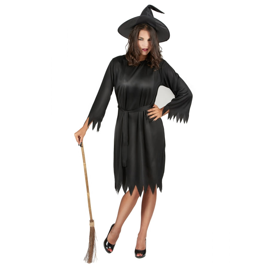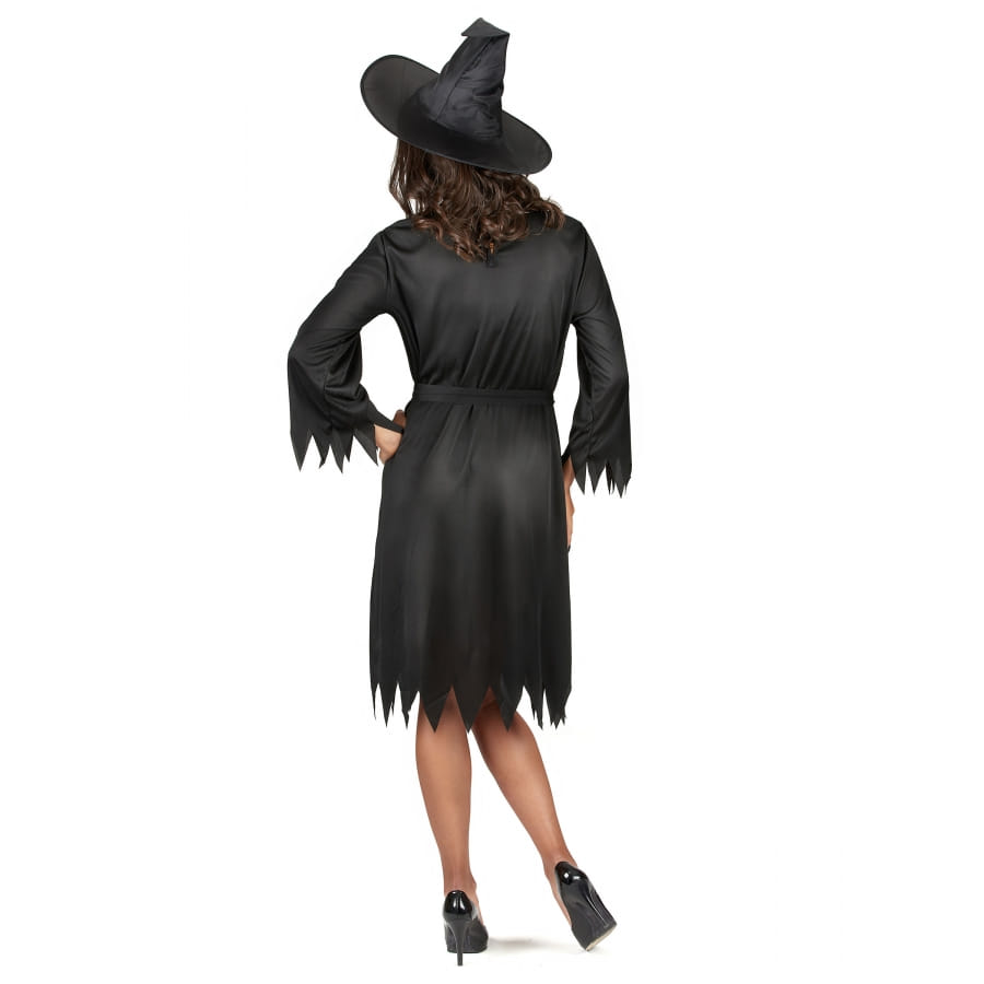 Il ne fait aucun doute que la couleur noire reste la couleur incontournable de la fête des morts. Alors, pourquoi ne pas en faire l'unique composant de votre tenue d'halloween. Pour ce faire, nous vous proposons sur notre site ce déguisement robe noire unie mi-courte de sorcière. Tous les éléments qui composent ce costume sont de couleur noire. Il est formé d'une robe arrivant à hauteur des genoux. Ses bordures sont découpées en dents de scie et ses manches longues se nouent avec de petits rubans rattachés. Le tissu choisi s'avère assez souple et fluide. La tenue compte aussi une ceinture faite dans la même matière que la robe. Pour le chapeau assorti, sa calotte allongée et pointue suffit à parfaire votre look de sorcière.
