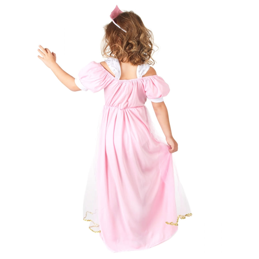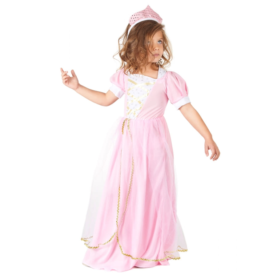 Toutes les petites filles tombent en admiration devant les robes de princesses dans les contes de fée. Que ce soit dans les livres ou à la télé, les princesses ont toujours une garde robe à vous couper le souffle ! La vôtre peut également bénéficier d'un ravissant déguisement robe princesse rose pour petite fille. Elle entrera dans cet univers magique dans une longue et magnifique robe en tissu rose souple. Elle est dotée de manches courtes et bouffantes de couleur rose, agrémentées de bretelles blanches. Vous observerez également une traîne en tulle transparent rosé ornée de bandes dorées pour les finitions, ainsi qu'un faux corsage cousu à l'avant. La robe est cintrée au niveau de la taille. Votre princesse portera aussi un serre-tête recouvert de tissu blanc, accompagné d'un diadème rose parsemé de sequins. Retrouvez ce déguisement sur happyfete en différentes tailles pour les 4 à 12 ans.