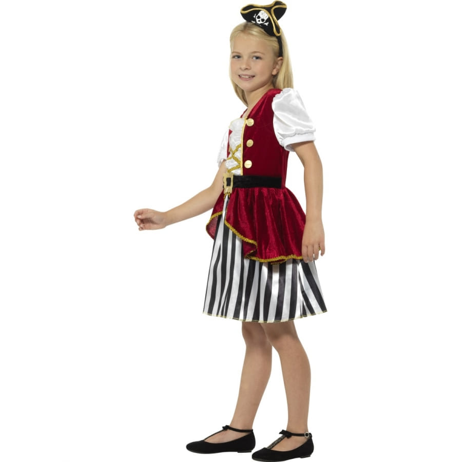 Les redoutables pirates recrutent des enfants dans leur équipage. Les petites filles seront ravies de faire partie de cette aventure. Le déguisement robe rayée de piratesse pour enfant est justement prévu pour un Halloween rempli d'action. Il est constitué par une robe blanche et noire, avec des rayures et une ceinture à boucle. La robe est agrémentée d'un tissu rouge et doré. Un mini tricorne de pirate de couleur noire et dorée, monté sur un bandeau est fourni pour compléter le costume. Un motif tête de pirate a été dessiné sur le chapeau. L'article est proposé pour les petites filles de 4 à 12 ans avec différentes tailles disponibles. Votre petite piratesse va en conquérir des trésors !