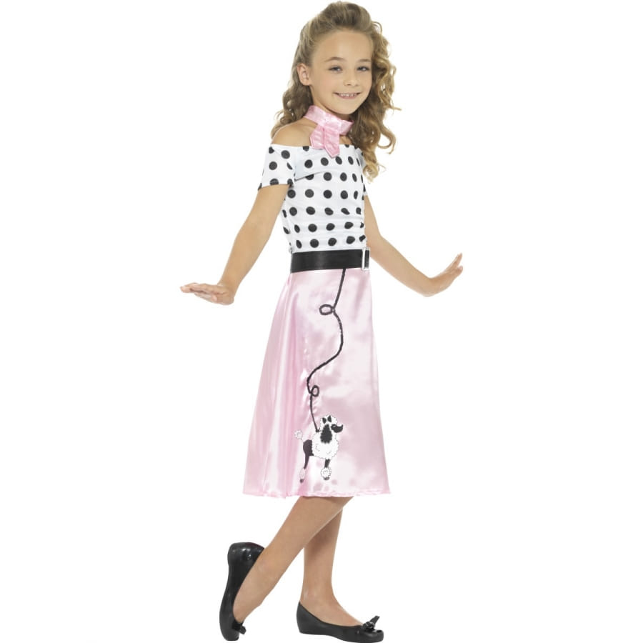 Il n'y a pas d'âge pour apprécier le rock'n roll. Les petites filles de 4 à 14 ans vont pouvoir se métamorphoser en danseuse rock grâce à ce déguisement robe rock rose années 50 pour enfant. L'article est formé d'une jolie robe rose satinée. Des petits pois noirs sur fond blanc ainsi qu'un motif caniche y ont été intégrés. Le joli noeud de couleur rose se place autour du cou. Quant à la ceinture à boucle noire, elle sert à souligner la taille. Des ballerines ou des talons hauts sont tous deux appropriés à la tenue. La fête commence, il ne manque plus qu'à bien s'échauffer avant d'enflammer la piste de danse !
