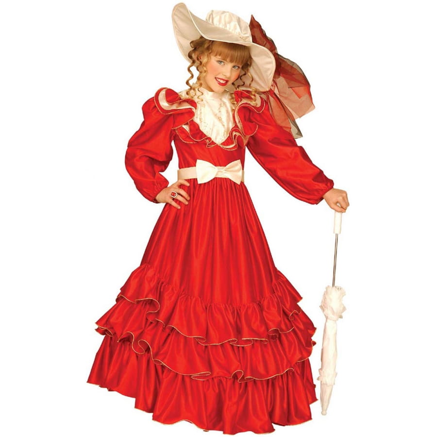 Le déguisement robe rouge de marquise pour fillette conviendra parfaitement aux jeunes filles qui aiment se la jouer grande dame. Nous avons une longue robe avec de longues manches en ballon, avec une encolure large soulignée par des volants rouge et beige. Un plastron de satin beige vient combler l'encolure. La robe est en forme de cloche marquée par trois niveaux de volants rouges sur le bas et tous les volants sont bordés de liseré doré. Une ceinture à noeud en satin beige s'attache à la taille et un joli chapeau satiné type capeline y est assorti. Sur ce dernier vient s'attacher un voilage rouge et beige placé sur le côté. C'est une tenue soignée et élégante, adaptée au carnaval.