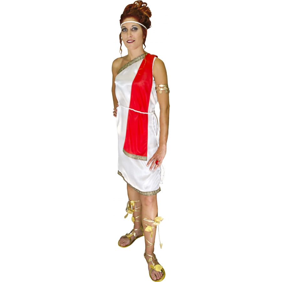 Déguisement de Romaine sexy composé d'une robe fine et courte de couleur blanche bordée de décorations avec une toge tenue rouge tenue à l'épaule, d'un bandeau blanc et d'une ceinture blanche finement tressée. Cet ensemble pour femme ou adolescente est 100% en polyester. Vous pourrez le porter pour un carnaval ou pour un enterrement de vie de garçon ou de jeune fille.
