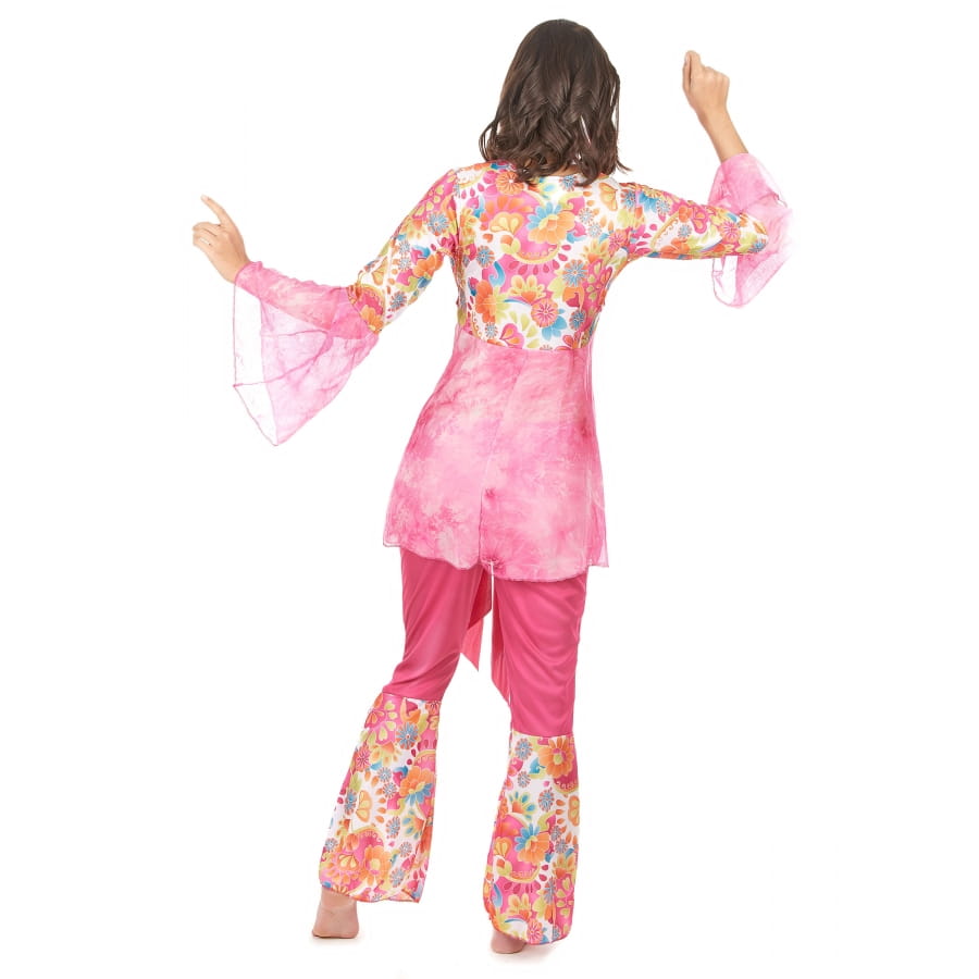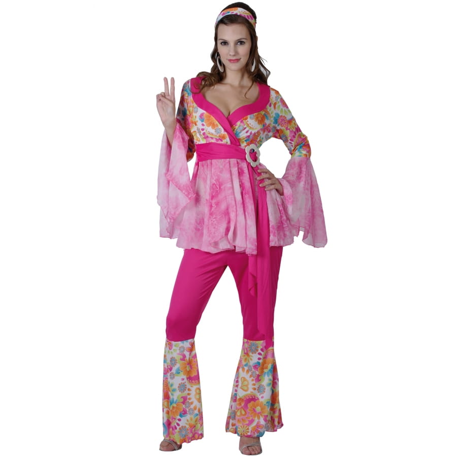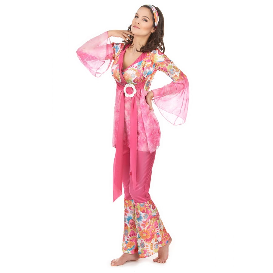 Mesdames, adoptez la mode des années 50 et 60 avec ce déguisement rose fleuri de hippie pour femme. Il est composé d'une tunique à motifs fleuri en cache coeur avec effet volants en mousseline à la taille et des manches évasées en mousseline. Au niveau de la poitrine, un effet ceinture avec une boucle en forme de fleur est cousue sur la tunique. Le bas est un pantalon de couleur rose, avec le même tissu que le haut de la tunique pour la partie patte d'eph. Et pour compléter la tenue, un bandeau dans les mêmes motifs que la tunique viendra ajouter une touche colorée à votre coiffure. Cette tenue fluide et légère fera de vous la hippie la plus cool et stylée de la soirée.