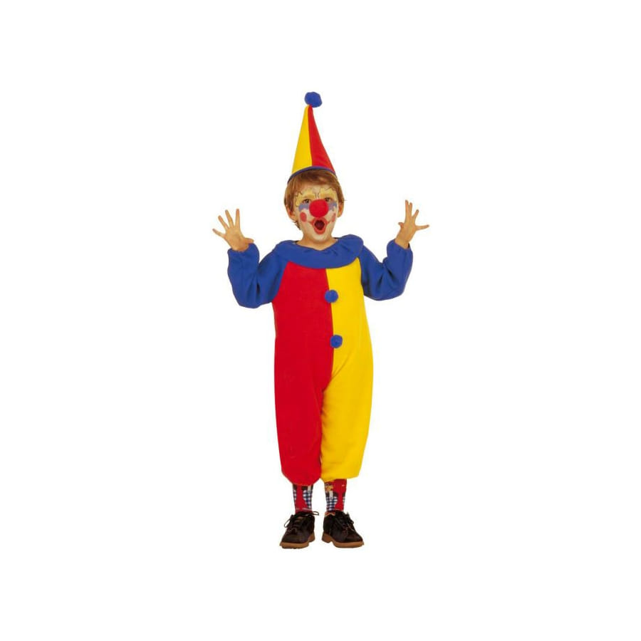 Chers parents, optez pour ce déguisement rouge et jaune de clown pour enfant pour habiller votre bambin à l'occasion d'une fête d'anniversaire. Le déguisement est composé d'une combinaison pantalon tricolore : rouge, jaune et bleu, qui est rembourrée de partout avec un effet bouffant. Elle est munie d'un col rond et de manches longues en bleu, et la partie gauche de la combinaison est en jaune tandis que celle de droite est rouge. Sur le milieu viennent se fixer deux gros boutons bleus. Le bord du pantalon est à élastique à mi-jambe. Enfin, le chapeau pointu complète le déguisement, il a un pompon bleu, son corps est bicolore : rouge et jaune, et il est bordé à sa base d'un liseré bleu. Le fameux nez de clown rouge est la touche finale qui va parfaire cette tenue, il est à retrouver sur notre site.