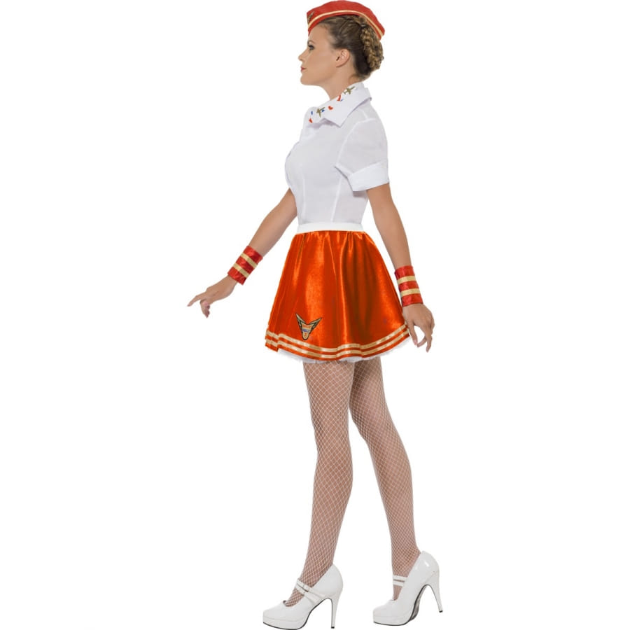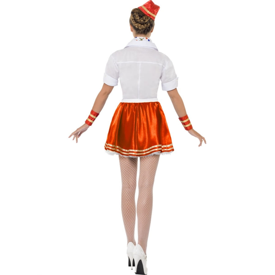 Déguisement d'hôtesse de l'air, pour femme, composé d'un chapeau rouge et doré, d'un foulard blanc à motifs, d'une paire de manchettes et d'une jupe tutu assorties au chapeau. Ce déguisement fera de vous une très jolie hôtesse à l'occasion d'une fête basées sur le thème des uniformes ou des métiers.