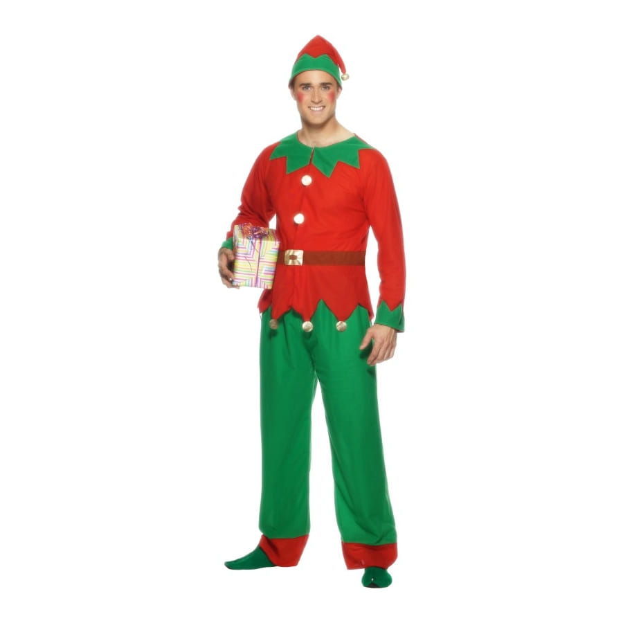 Déguisement d'aide de Père Noël, pour homme, composé d'une tunique rouge et verte et d'un chapeau assorti avec grelot doré. Cet ensemble est disponible en taille M, L ou XL. Aidez le Père Noël lors de la distribution des cadeaux lors de la veillée de Noël.
