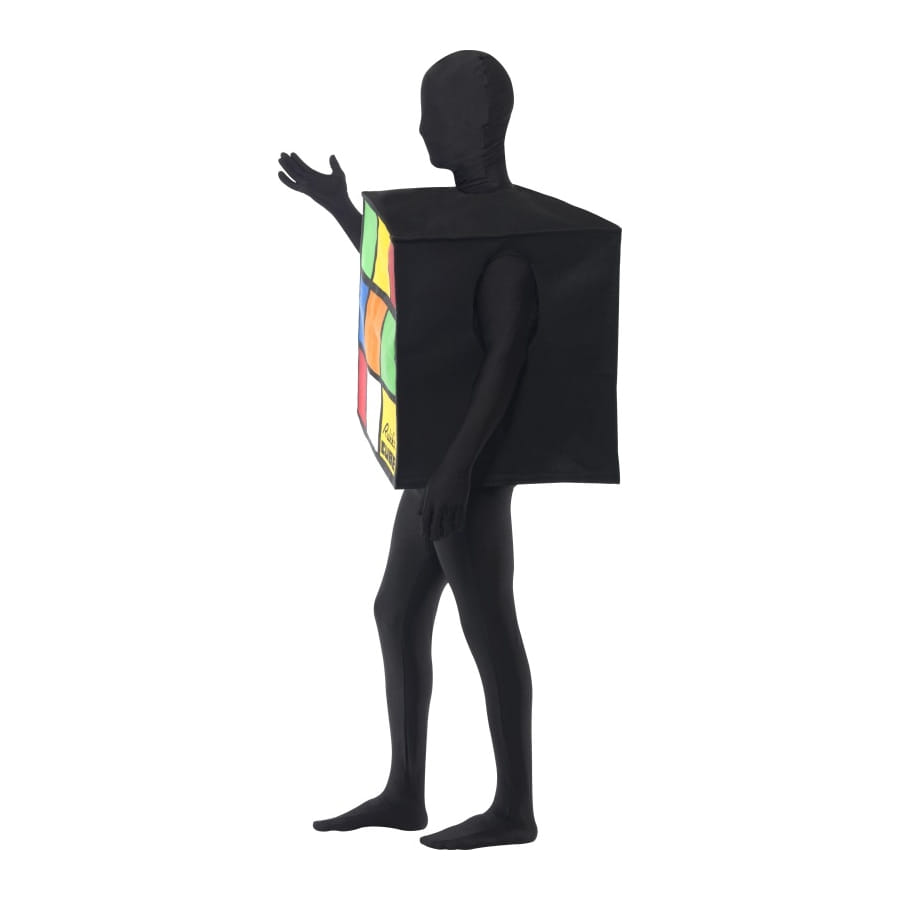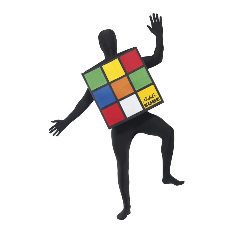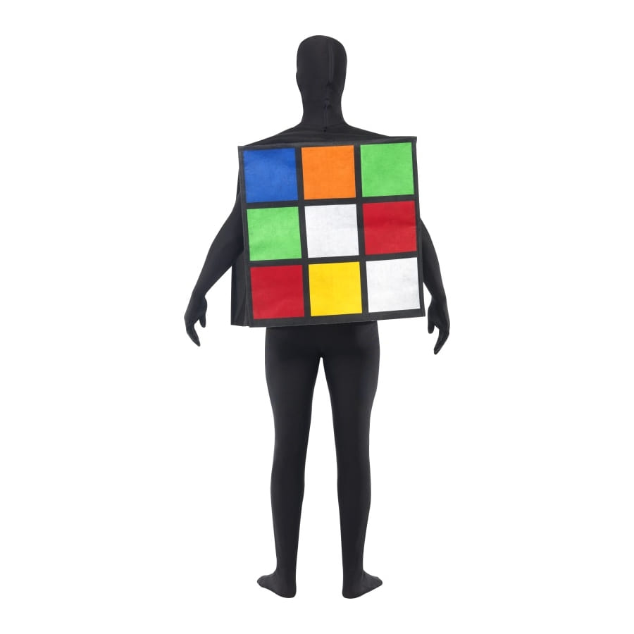 Déguisement de Rubik's Cube, pour homme ou femme, composé d'un cube blanc, vert, jaune, rouge, orange, bleu et noir. Ce déguisement original convient à un enterrement de vie de garçon ou de jeune fille.