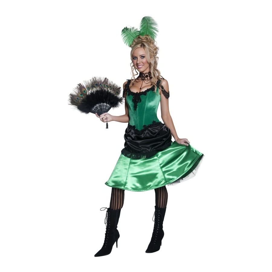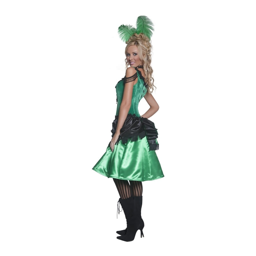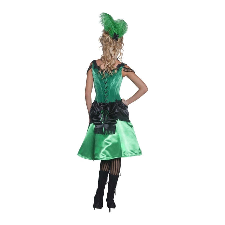 Déguisement de femme de saloon de couleur verte et noire, composé d'une robe et d'un chapeau. Le haut de la robe est en forme de bustier avec un jupon en satin noir et vert. Le chapeau est composé de deux magnifiques plumes vertes. Choisissez entre une taille S, M ou L lors de votre commande. Cette robe est idéale pour vos fêtes westerns.
