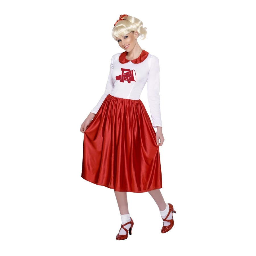 Ce déguisement de Sandy de grease vous pourrez le porter pour un enterrement de vie de jeune fille ou encore pour une fête ayant pour thème le cinéma. Vous pourrez aussi incarner une danseuse dans ce déguisement qui est une robe. Cette robe manche longue de couleur blanche il y a un motif au centre et le col ainsi que le bas de la robe est rouge.