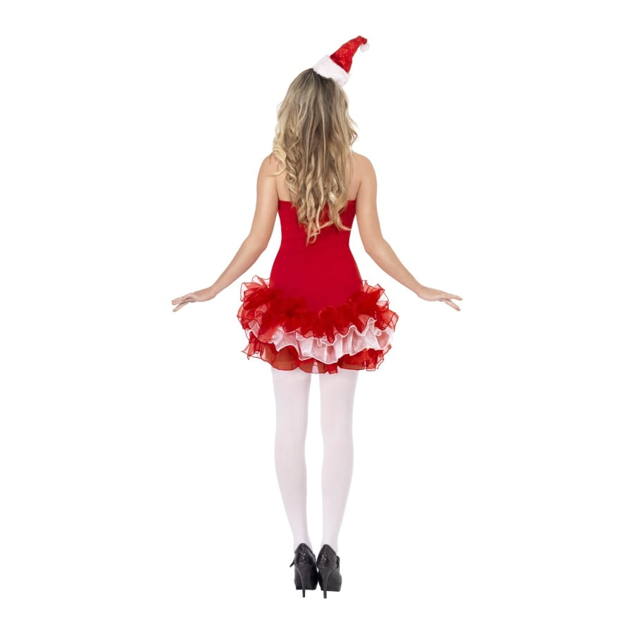 Déguisement de Mère Noël, pour femme, composé d'une robe tutu rouge et blanche, avec ceinture noire. Le haut de la robe est en corset avec bordure blanche et le res est en plusieurs couches de tulles rouges et blanches. Cette robe fera de vous une Mère Noël moderne et sexy à l'occasion de la Noël.