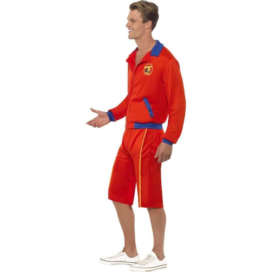 Un costume de sauveteur pour homme qui est composé d'une veste manche longue de couleur rouge et bleu, d'un short long de couleur rouge avec bordure doré. Avec déguisement sous licence alerte à malibu vous pourrez incarner un sauveteur pour le carnaval.