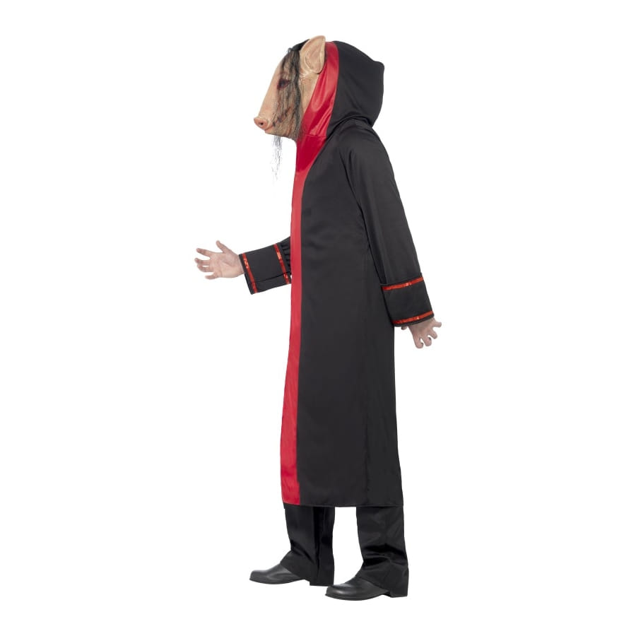 Les pires personnages de films d'horreur se donnent rendez-vous à Halloween ! Dans votre cas, vous pourrez vous inspirer des films "Saw". Cette histoire au scénario très original en a fait trembler plus d'un ! Justement, vous pouvez incarnez un tueur sanguinaire et jouer quelques tours à vos amis ! Entrez dans la peau de l'apprenti de Jigsaw : le fameux cochon ! Vous disposerez de son déguisement complet, constitué par une longue robe noire et rouge surmontée par une capuche, ainsi que de l'authentique masque de ce cochon meurtrier. Vous deviendrez ainsi son portrait craché ! L'ensemble doit se nettoyer uniquement à sec. Il vous sera livré en taille M correspondant à une poitrine de 96-101 cm et un entrejambe de 83 cm.