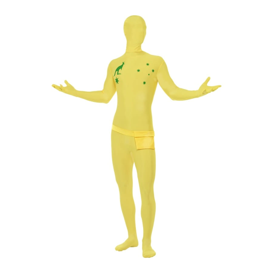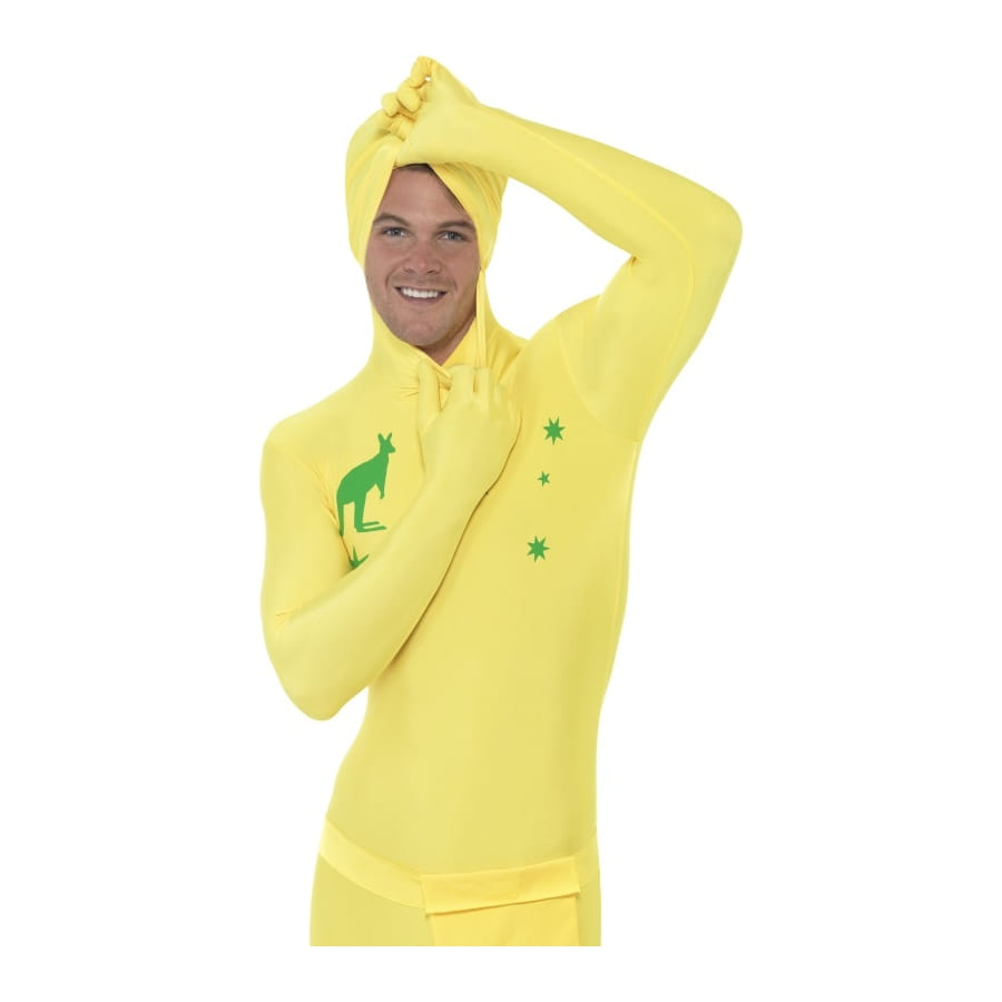 Ce déguisement seconde peau Australie vous pourrez le porter pour une fête ayant pour thème autour du monde ou encore pour la fête nationale. Personne ne vous reconnaitra dans ce déguisement qui vous couvrira des pieds à la tête. Ce déguisement est de couleur jaune avec des étoiles verte dessus ainsi qu'un kangourou.
