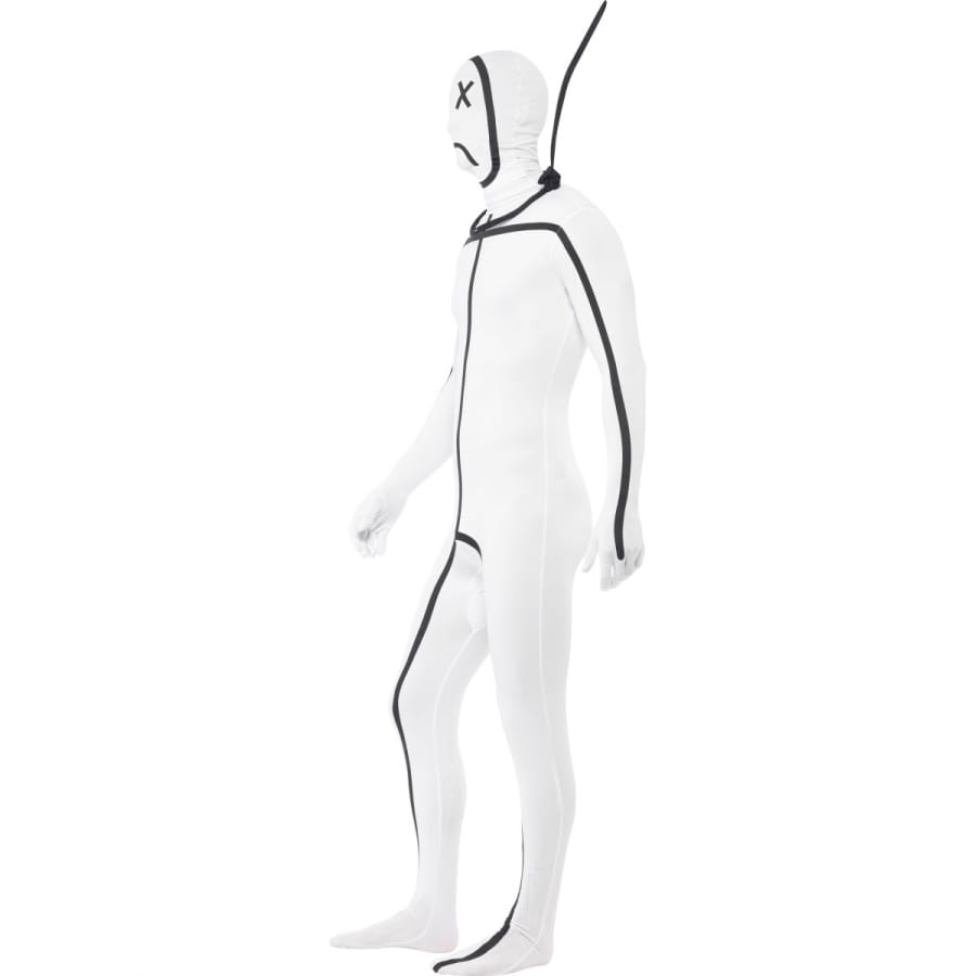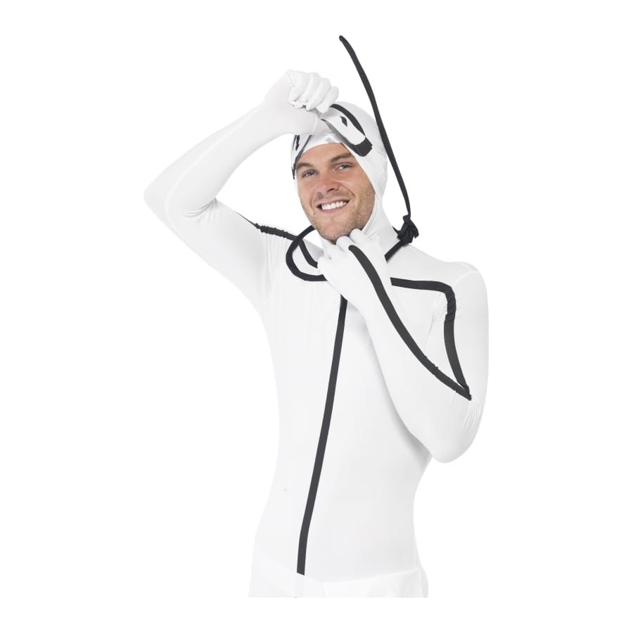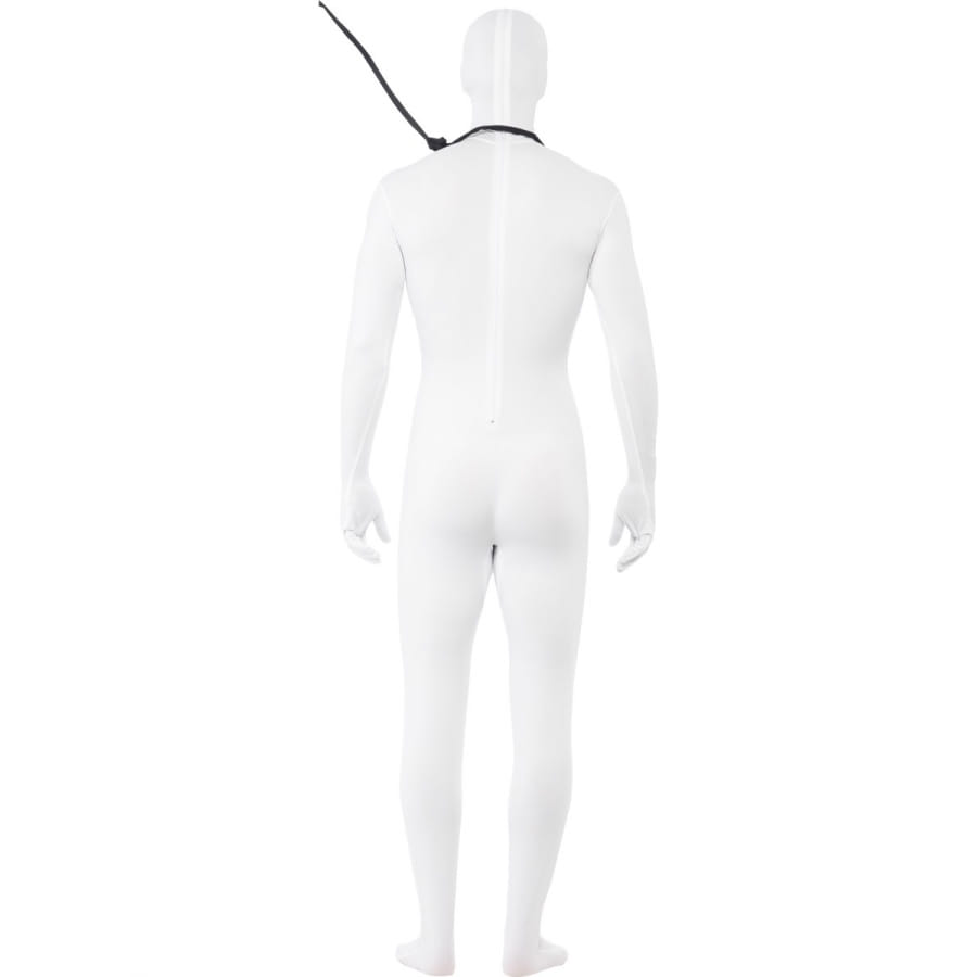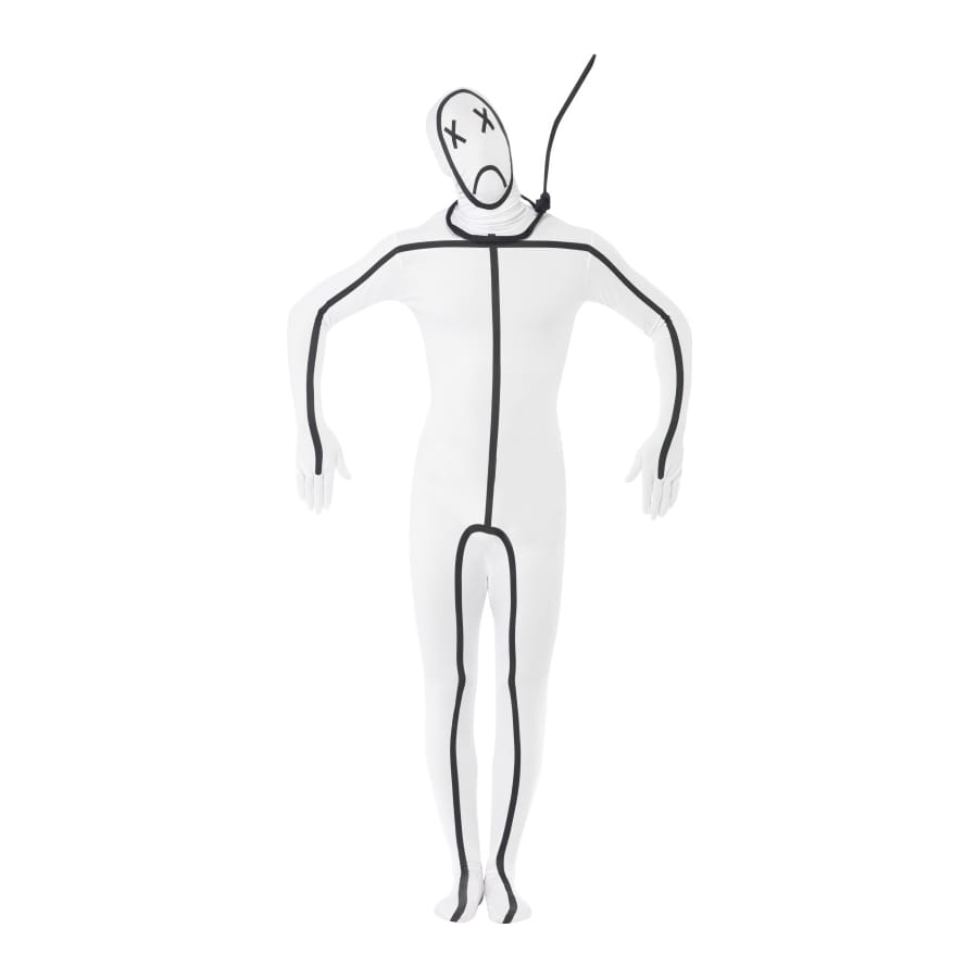 Un autre costume sous licence seconde peau, eh oui! Celui ci est différent des autres, il est tout blanc. Vous avez déjà joué au jeu du pendu, sur une feuille, entre amis? Maintenant vous pouvez y jouer en vrai. Optez pour ce déguisement fait d'un ensemble moulant seconde-peau et d'un noeud coulant. Il est tout blanc avec des traits noirs sur les membres et au milieu ; votre visage, recouvert totalement, laissera apparaître deux croix noires au niveau des yeux et un trait représentant une bouche mécontente au niveau de la bouche. Tout cela s'accorde très bien avec le noeud coulant en noir que vous mettrez autour du cou. Les tailles disponibles sont : taille L (poitrine de 106 à 110 cm et entre-jambe de 83,8 cm) et taille M (poitrine de 96 à 101 cm et entre-jambe de 83 cm). A nettoyer à sec pour en conserver l'aspect et la qualité!