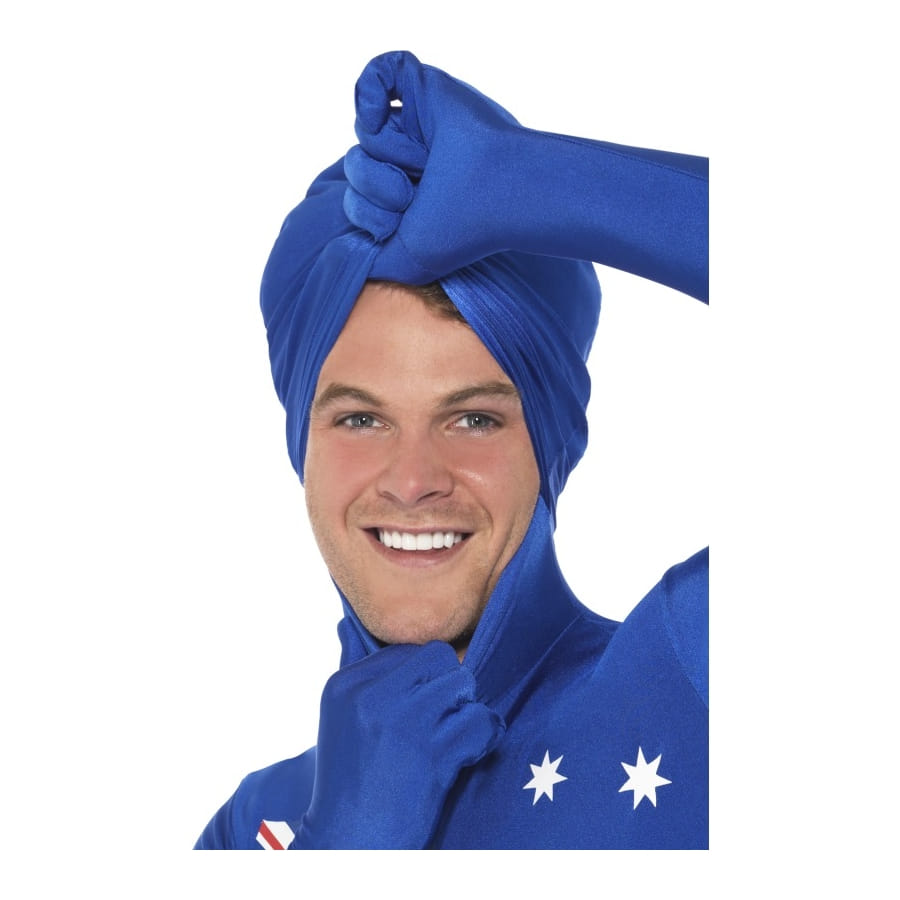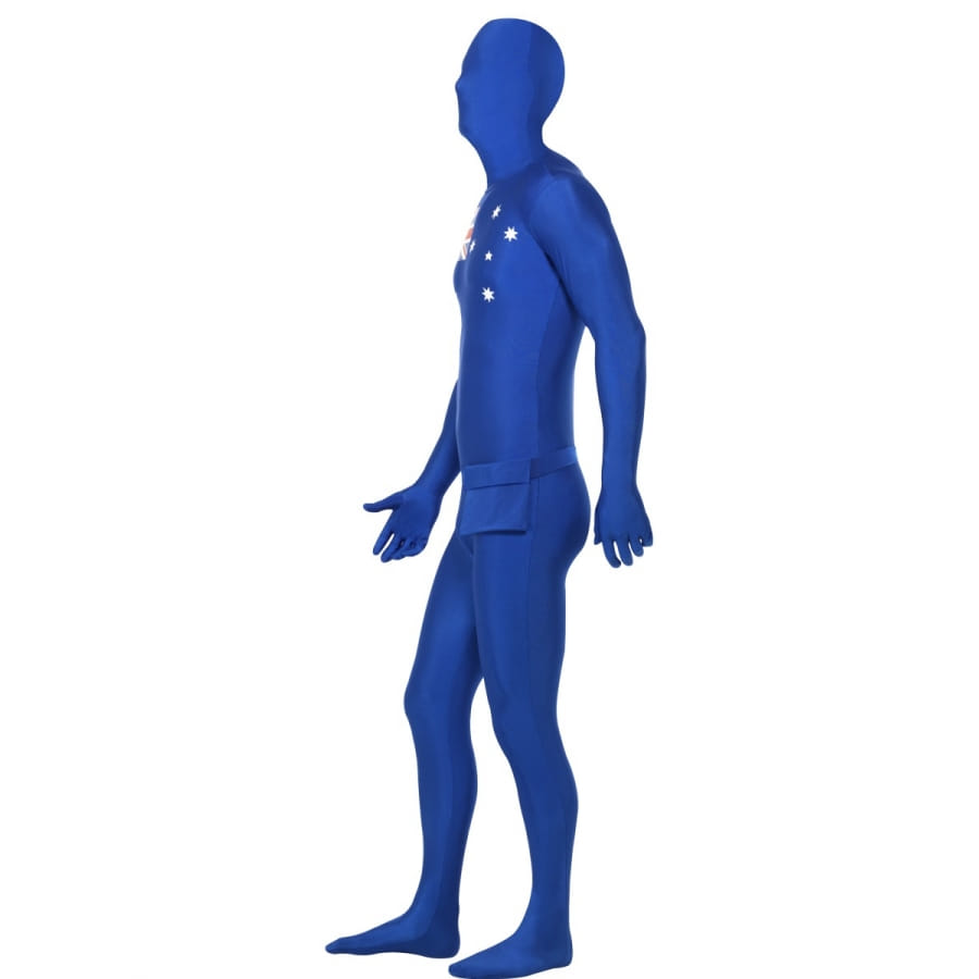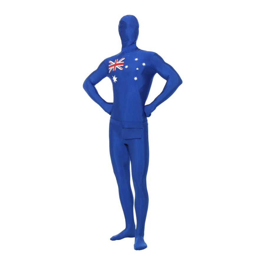 Déguisement de drapeau australien, pour homme ou femme, constitué d'une seconde peau de couleur bleue. Cette combinaison recouvrira la totalité de votre corps. Elle est disponible en taille M, L ou XL. Elle vous ira comme un charme à l'occasion d'une fête nationale australienne.