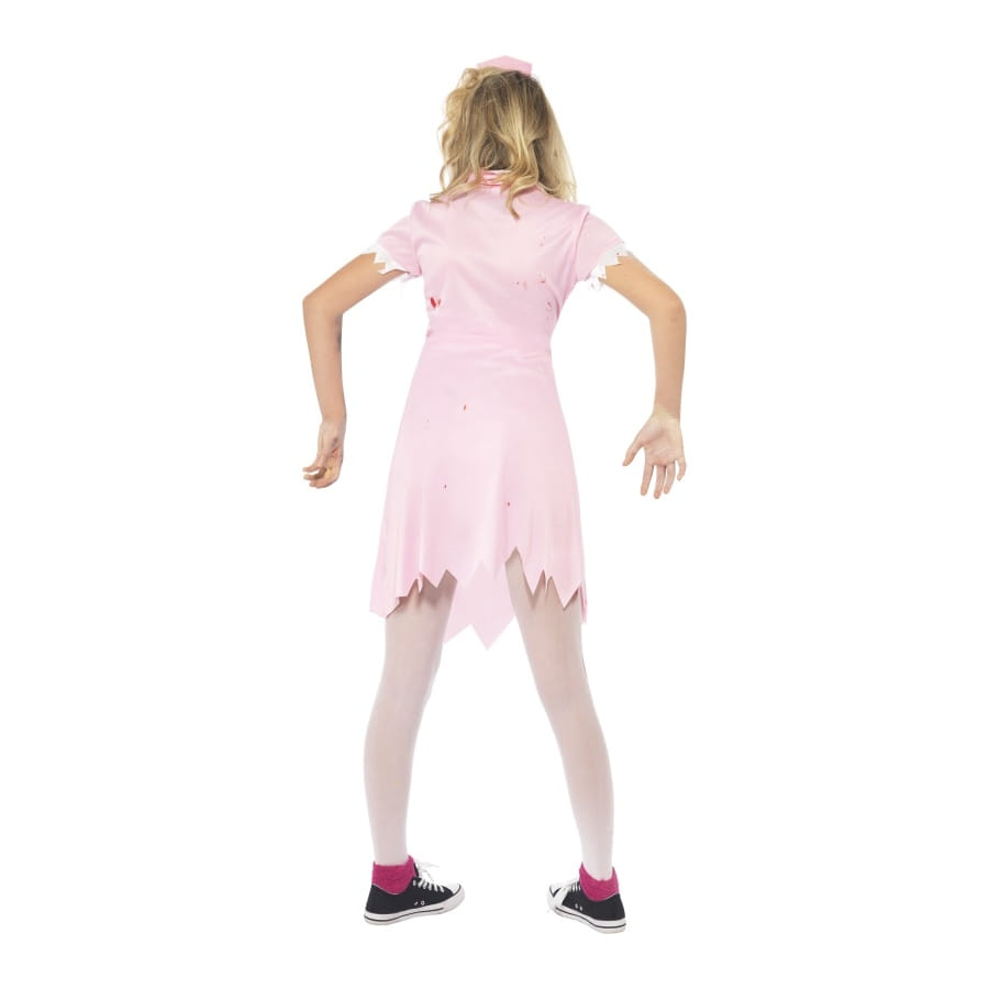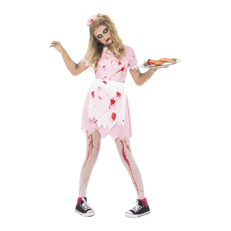 Déguisement de serveuse zombie, pour femme, composé d'une robe rose avec tablier blanc et d'un bandeau assorti à la robe, tous deux ensanglantés. Ce déguisement d'Halloween fera de vous un personnage tout droit sorti d'un film d'horreur.