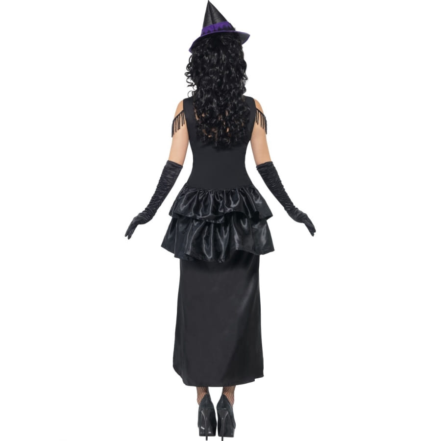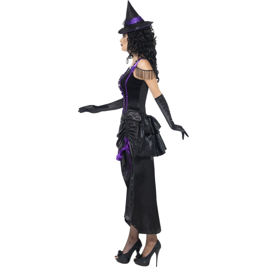 Déguisement de sorcière sexy, pour femme, composé d'une robe avec jupe attachée et d'un chapeau. La robe est en satin violet et noir, avec un haut en forme de corset avec lacets tandis que le chapeau pointu de sorcière est attaché à un serre-tête. Le tout est disponible en taille S, M ou L. Très original, cet ensemble possède une petite touche burlesque!