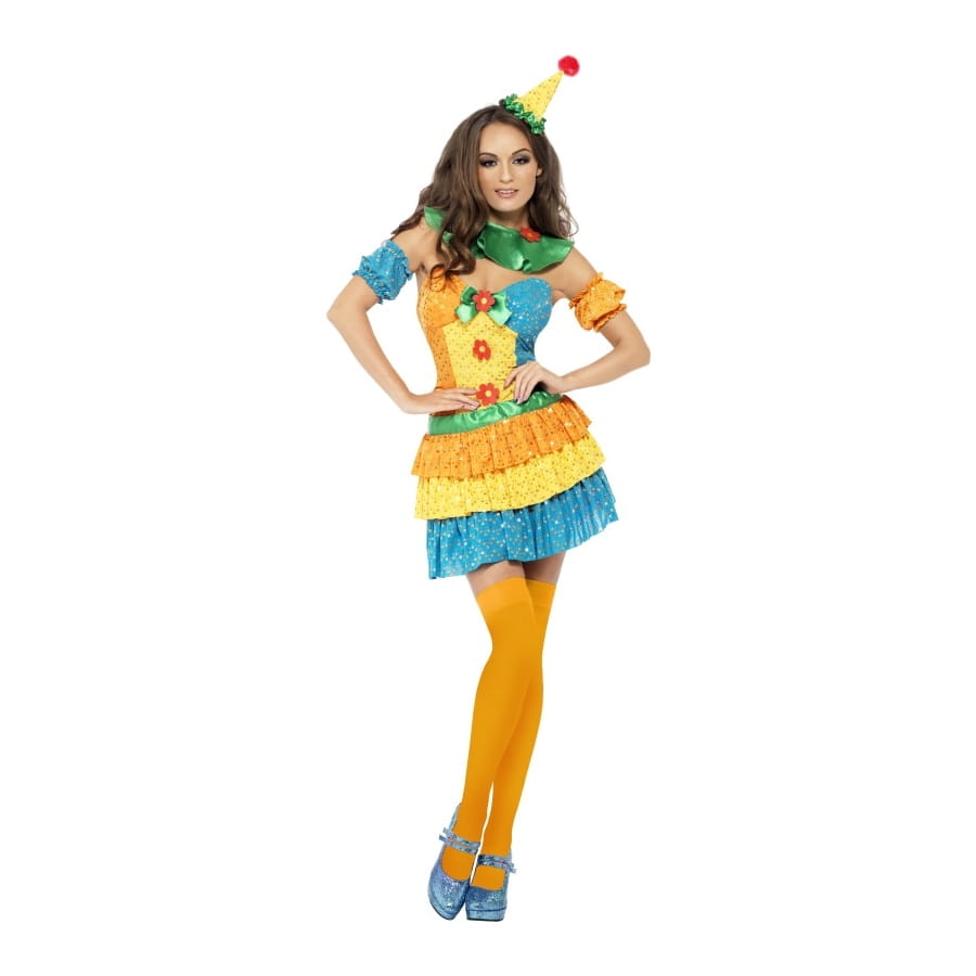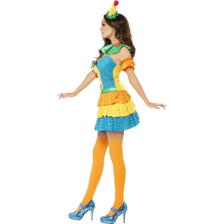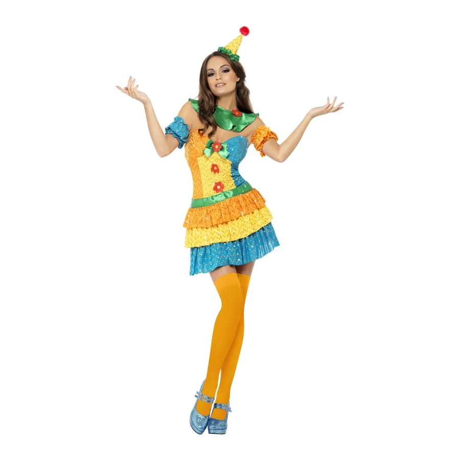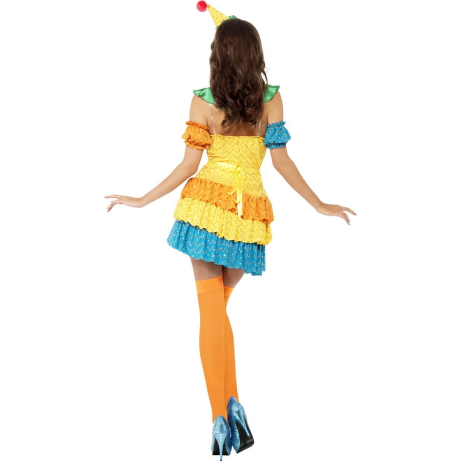 Déguisement de clown sexy, pour femme, composé d'une robe, d'un chapeau et d'une collerette. Le tout est très coloré, de couleur aune, verte, bleue et orange, avec des volants, des noeuds et des fleurs pour tout décorer. Choisissez entre une taille S, M ou L au moment de votre commande. Ce déguisement de clown fera plus tourner les têtes que rire.