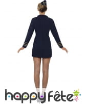 Un costume hôtesse de l'air sexy pourquoi ne pas le porter pour une soirée sur le thème de l'uniforme. Vous pourrez aussi le porter pour incarner une séductrice. Ce déguisement est composé d'une robe bleu manche longue avec des bandes doré sur l’extrémité des manches et des boutons doré. Il est aussi composé d'un chapeau bleu avec bordures doré.