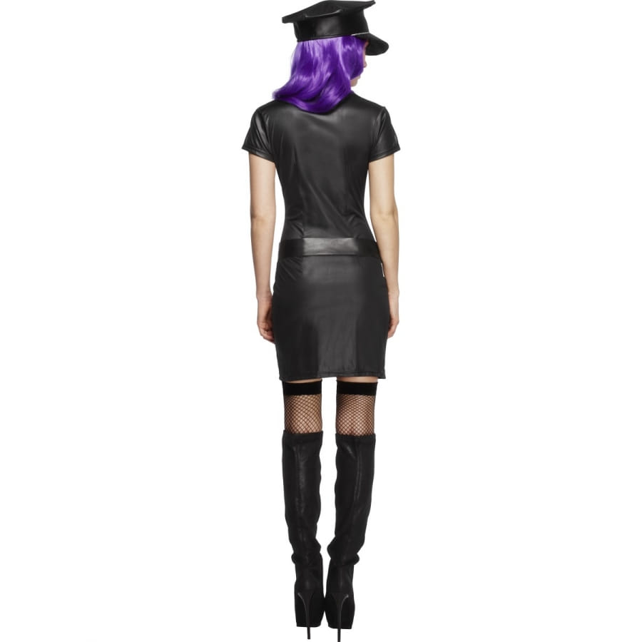 Déguisement de policière sexy, composé d'une robe en cuir noir, d'une ceinture assortie et d'une casquette noire avec insigne argentée. Cet ensemble est disponible en taille XS, S, M ou L. Ultra moulante, cette robe donnera vie aux fantasmes de votre partenaire.