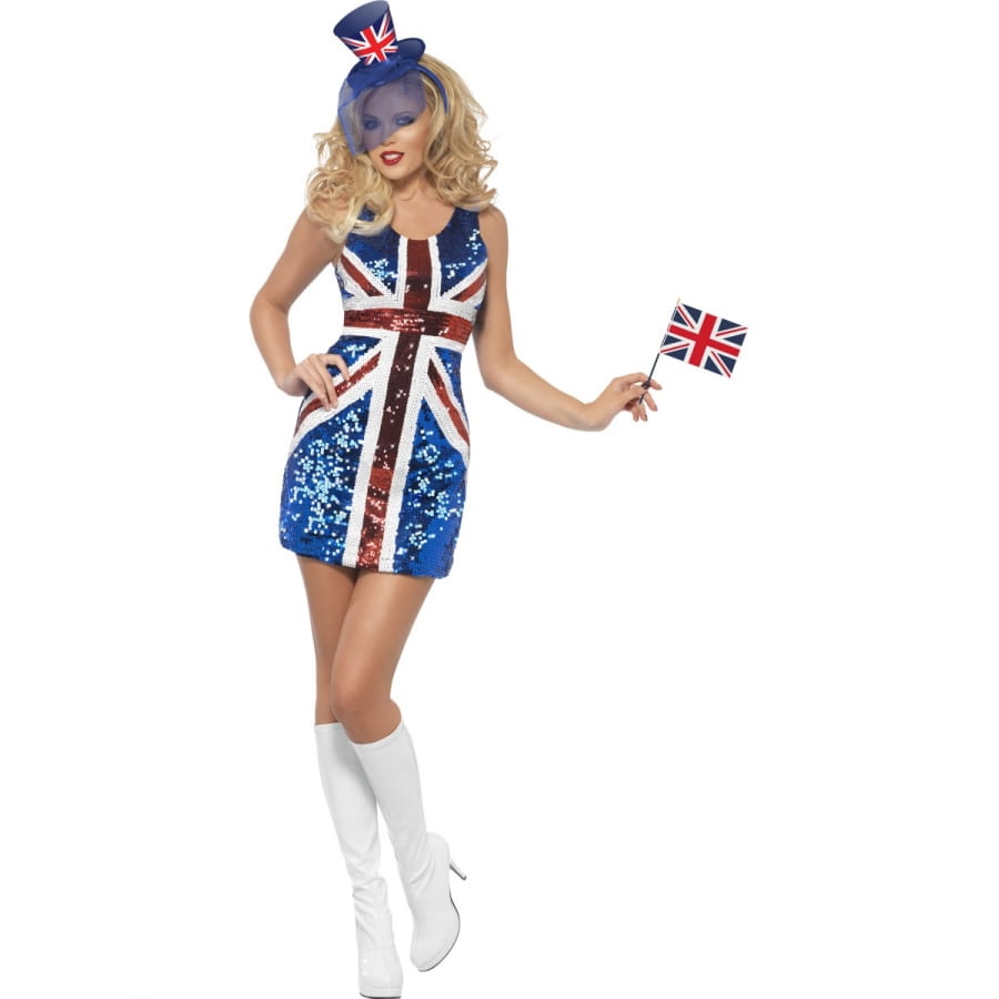 Déguisement anglais pour femme composé d'une robe disponible en taille S, M ou L. La robe, entièrement paillettée, est imprimée aux couleurs du drapeau britannique, de couleur bleue, blanche et rouge. Elle vous rendra sexy et glamour à la fois. C'est la réplique exact de la tenue préférée de la très célèbre Ginger Spice.