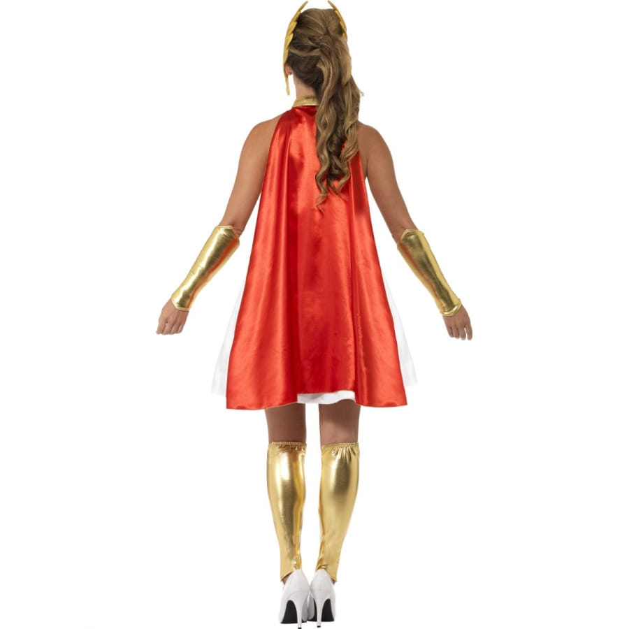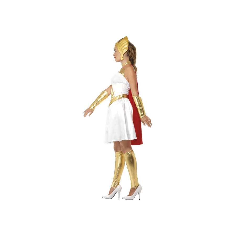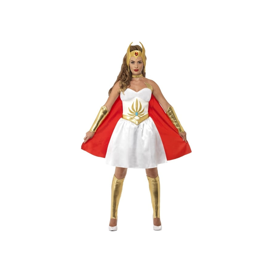 Soyez prête pour ôter votre planète Etheria de l'oppression de la Hord avec ce déguisement She-ra la princesse du pouvoir, complet et de haute qualité ! Ce somptueux costume est constitué par une robe bustier, une cape, une coiffe, une paire de gantelets et de jambières. La robe est de couleur blanche ornée d'une fleur dorée au milieu, avec une fausse pierre bleue. La cape est rouge et s'attachera au niveau du cou. La coiffe est dorée, ornée d'une fausse pierre rouge. Et les jambières et les manchettes sont également dorées et termineront à merveille l'ensemble. Ce déguisement est disponible en tailles : M/ S/ XS. Pour une soirée sur le thème Super-héros ou Aventure, ne ratez pas ce costume et utilisez vos super pouvoirs !!