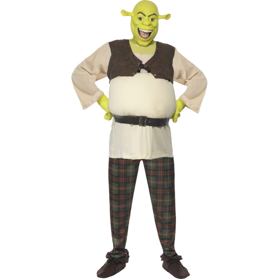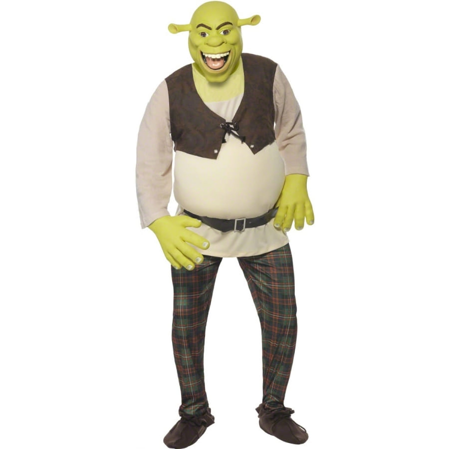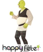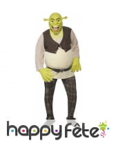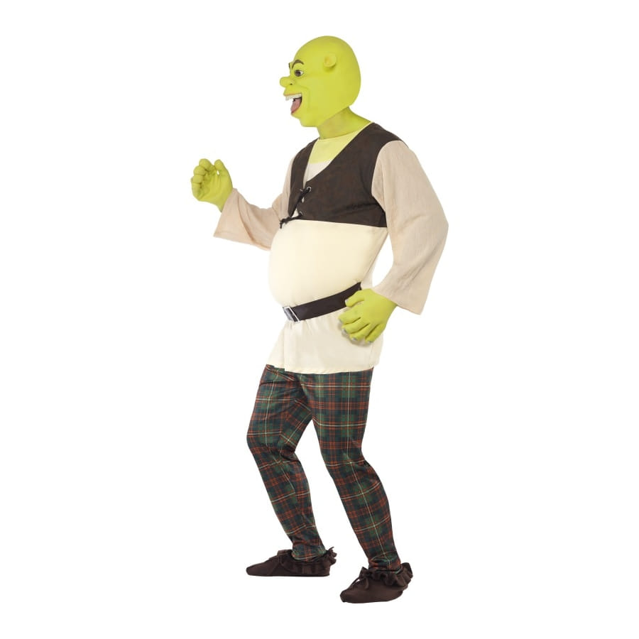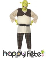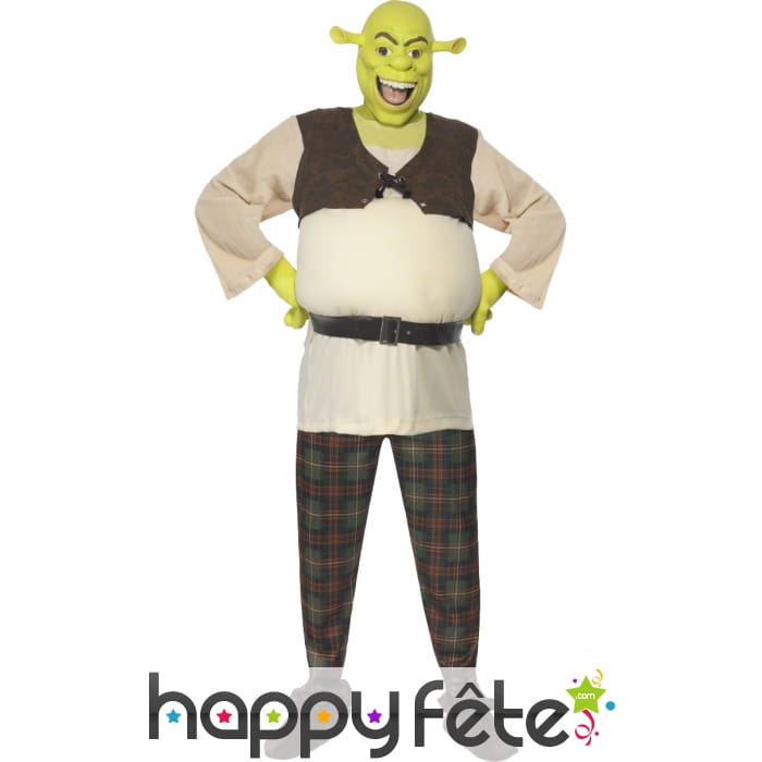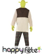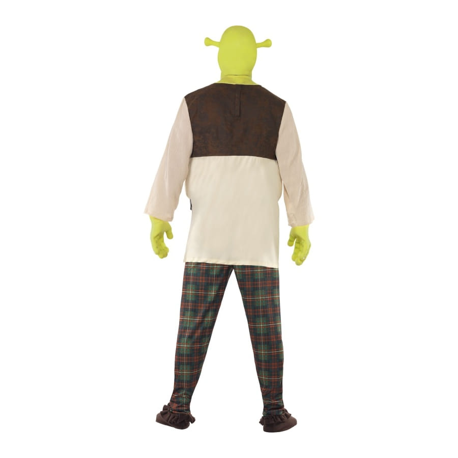 Déguisement de Shrek sous licence, pour homme, composé d'un top blanc et marron, d'un pantalon à carreaux, d'une paire de mains et d'un masque verts. Le tout est disponible en taille S, M ou L. Il sera idéal pour une fête basée sur un thème de dessins animés.