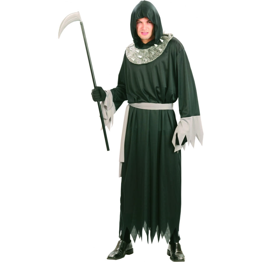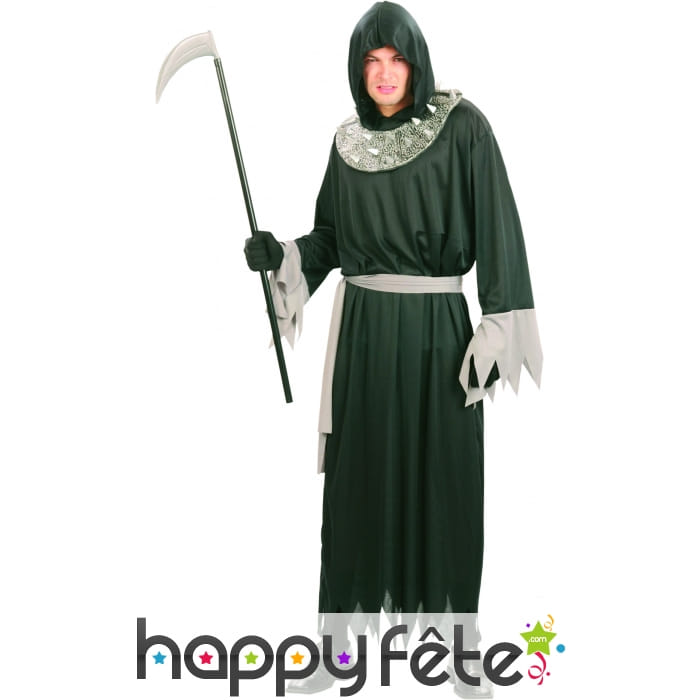Déguisement de Skull Warrior, pour homme, composé d'une tunique verte avec cagoule assortie, d'un collier gris avec piques et d'une ceinture grise. Le tout est disponible en taille S, M ou L. Cet ensemble sera parfait pour Halloween ou pour une soirée Donjons et Dragons ou encore pour toute autre fête médiévale.