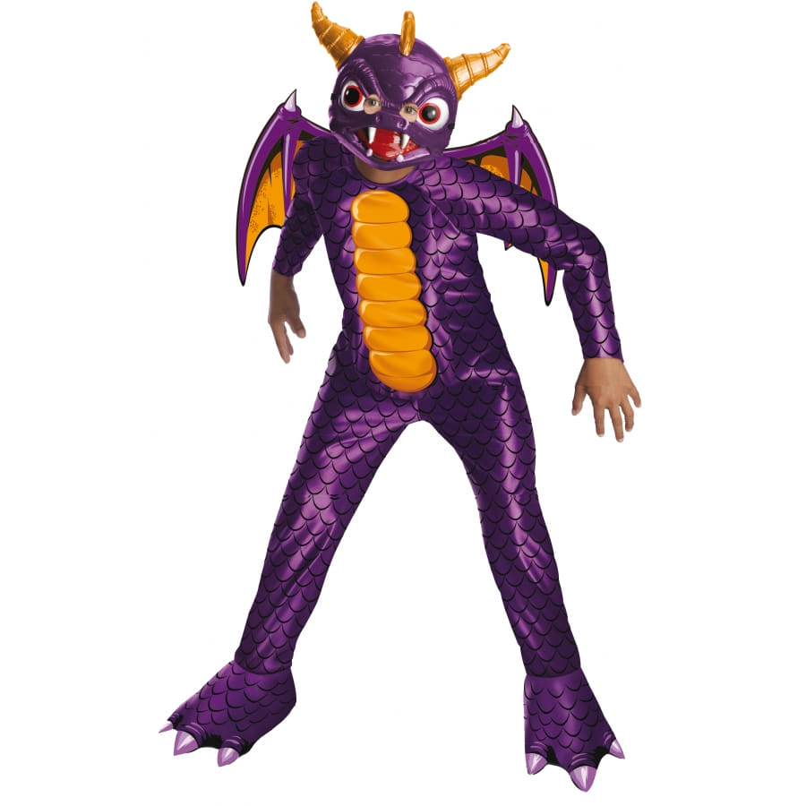 De nombreux petits garçons adeptes du fantastique adorent jouer à Skylanders et rêvent en secret de s'intégrer dans a peau de leurs héros favoris : Ignitor, Chop Chop, Stealth Elf ou Trigger Happy. Que demander de plus que ce costume de Skylanders, sous licence Spyro, que nous vous proposons ? Il est de couleur violette et orange, et c'est pratiquement une tenue idéale pour les fêtes d'Halloween, vraiment une tête à faire peur. Les petits garçons auront un réel plaisir à reconstruire le coeur de lumière grâce à leurs supers pouvoirs. Conçu pour les tailles L/M/S, la tenue est formée d'une combinaison avec des ailes de chauve-souris, et d'un masque avec de grands yeux et des cornes jaunes